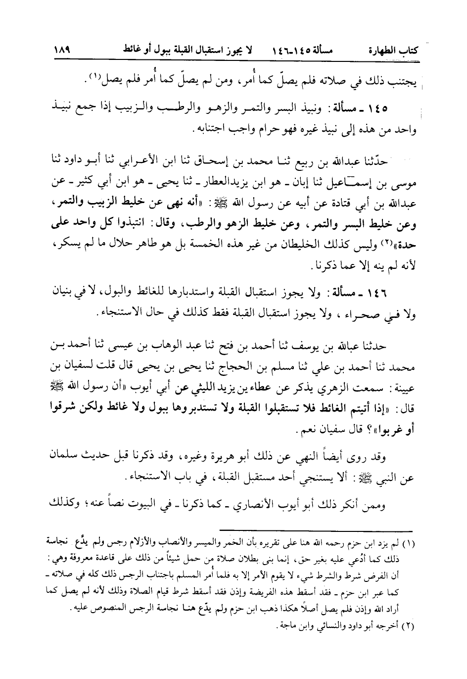 146 - مَسْأَلَةٌ: وَلَا يَجُوزُ اسْتِقْبَالُ الْقِبْلَةِ وَاسْتِدْبَارُهَا لِلْغَائِطِ وَالْبَوْلِ، لَا فِي بُنْيَانٍ وَلَا فِي صَحْرَاءَ، وَلَا يَجُوزُ اسْتِقْبَالُ الْقِبْلَةِ فَقَطْ كَذَلِكَ فِي حَالِ الِاسْتِنْجَاءِ.