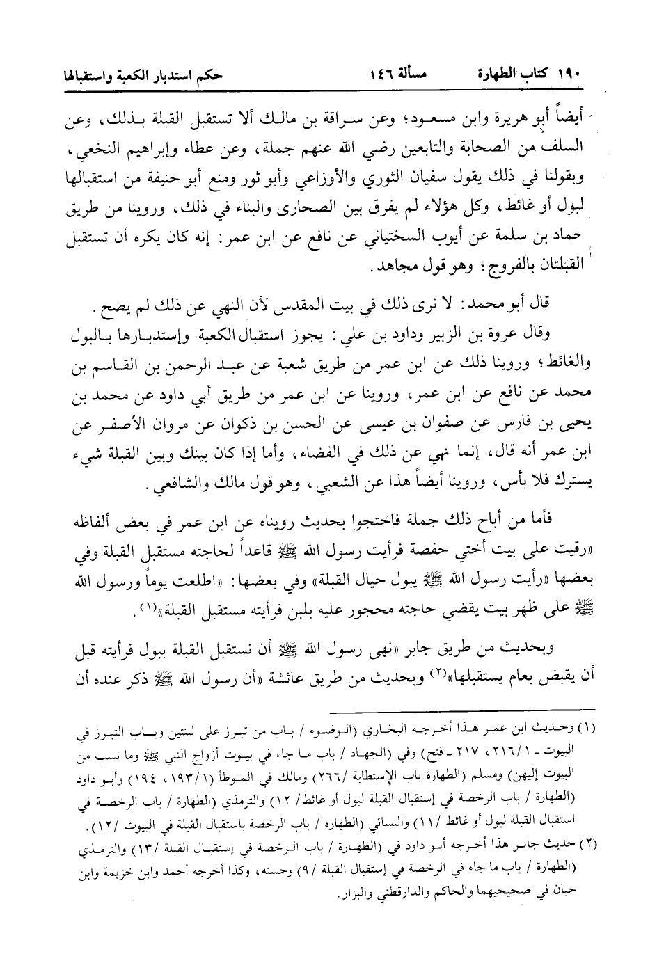أَيْضًا أَبُو هُرَيْرَةَ وَابْنُ مَسْعُودٍ، وَعَنْ سُرَاقَةَ بْنِ مَالِكٍ أَلَّا تَسْتَقْبِلَ الْقِبْلَةَ بِذَلِكَ، وَعَنْ السَّلَفِ مِنْ الصَّحَابَةِ وَالتَّابِعِينَ - رَضِيَ اللَّهُ عَنْهُمْ - جُمْلَةً، وَعَنْ عَطَاءٍ وَإِبْرَاهِيمَ النَّخَعِيِّ، وَبِقَوْلِنَا فِي ذَلِكَ يَقُولُ سُفْيَانُ الثَّوْرِيُّ وَالْأَوْزَاعِيُّ وَأَبُو ثَوْرٍ وَمَنَعَ أَبُو حَنِيفَةَ مِنْ اسْتِقْبَالِهَا لِبَوْلٍ أَوْ غَائِطٍ، وَكُلُّ هَؤُلَاءِ لَمْ يُفَرِّقْ بَيْنَ الصَّحَارِي وَالْبِنَاءِ فِي ذَلِكَ، وَرُوِّينَا مِنْ طَرِيقِ حَمَّادِ بْنِ سَلَمَةَ عَنْ أَيُّوبَ السِّخْتِيَانِيِّ عَنْ نَافِعٍ عَنْ ابْنِ عُمَرَ: أَنَّهُ كَانَ يَكْرَهُ أَنْ تُسْتَقْبَلَ الْقِبْلَتَانِ بِالْفُرُوجِ، وَهُوَ قَوْلُ مُجَاهِدٍ.