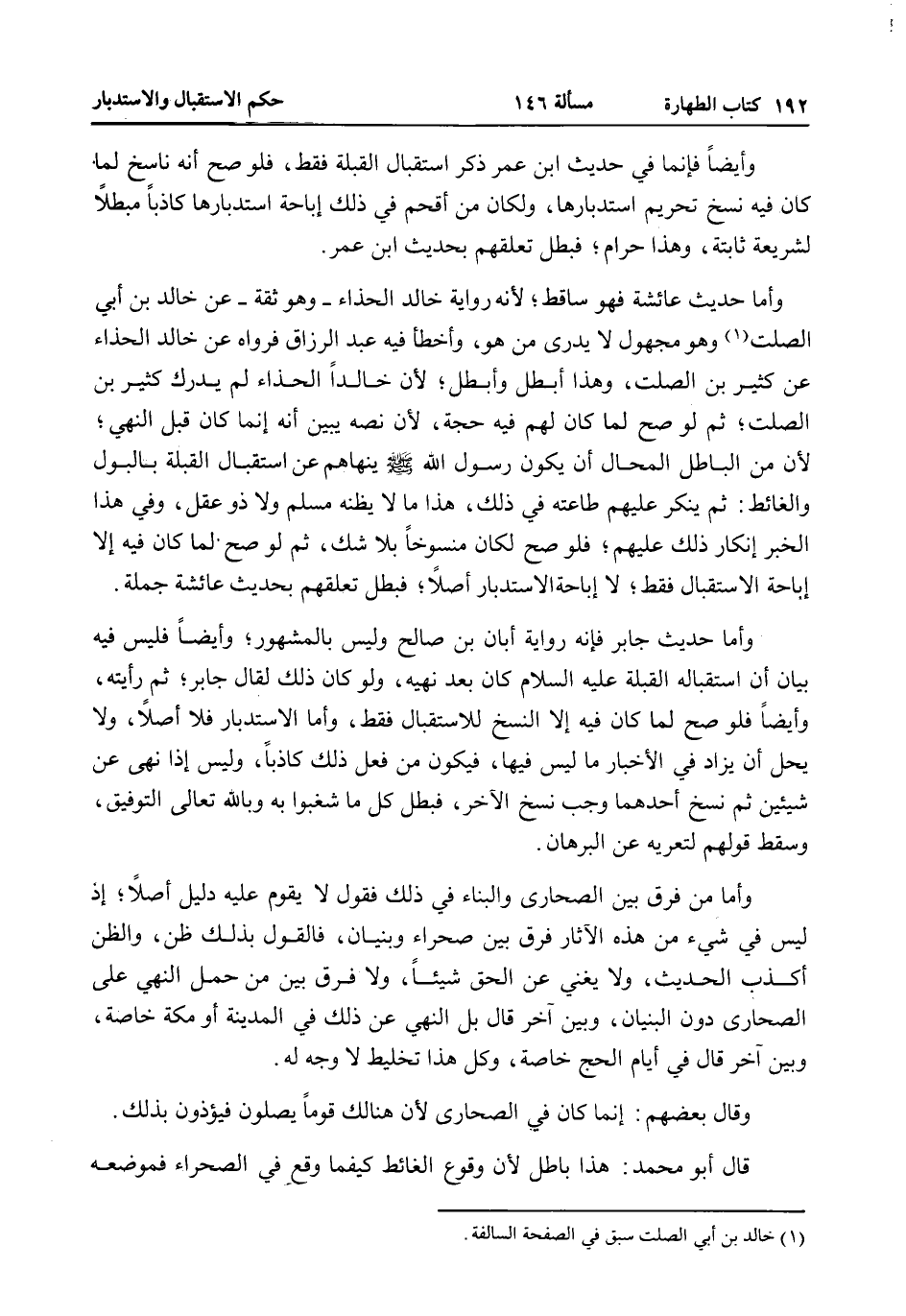 وَأَمَّا حَدِيثُ عَائِشَةَ فَهُوَ سَاقِطٌ؛ لِأَنَّهُ رِوَايَةُ خَالِدٍ الْحَذَّاءِ - وَهُوَ ثِقَةٌ - عَنْ خَالِدِ بْنِ أَبِي الصَّلْتِ وَهُوَ مَجْهُولٌ لَا يُدْرَى مَنْ هُوَ، وَأَخْطَأَ فِيهِ عَبْدُ الرَّزَّاقِ فَرَوَاهُ عَنْ خَالِدٍ الْحَذَّاءِ عَنْ كَثِيرِ بْنِ الصَّلْتِ، وَهَذَا أَبْطَلُ وَأَبْطَلُ؛ لِأَنَّ خَالِدًا الْحَذَّاءَ لَمْ يُدْرِكْ كَثِيرَ بْنَ الصَّلْتِ، ثُمَّ لَوْ صَحَّ لَمَا كَانَ لَهُمْ فِيهِ حُجَّةٌ، لِأَنَّ نَصَّهُ يُبَيِّنُ أَنَّهُ إنَّمَا كَانَ قَبْلَ النَّهْيِ؛ لِأَنَّ مِنْ الْبَاطِلِ الْمُحَالِ أَنْ يَكُونَ رَسُولُ اللَّهِ - صَلَّى اللَّهُ عَلَيْهِ وَسَلَّمَ - يَنْهَاهُمْ عَنْ اسْتِقْبَالِ الْقِبْلَةِ بِالْبَوْلِ وَالْغَائِطِ ثُمَّ يُنْكِرُ عَلَيْهِمْ طَاعَتَهُ فِي ذَلِكَ، هَذَا مَا لَا يَظُنُّهُ مُسْلِمٌ وَلَا ذُو عَقْلٍ، وَفِي هَذَا الْخَبَرِ إنْكَارُ ذَلِكَ عَلَيْهِمْ، فَلَوْ صَحَّ لَكَانَ مَنْسُوخًا بِلَا شَكٍّ، ثُمَّ لَوْ صَحَّ لَمَا كَانَ فِيهِ إلَّا إبَاحَةُ الِاسْتِقْبَالِ فَقَطْ، لَا إبَاحَةُ الِاسْتِدْبَارِ أَصْلًا، فَبَطَلَ تَعَلُّقُهُمْ بِحَدِيثِ عَائِشَةَ جُمْلَةً.