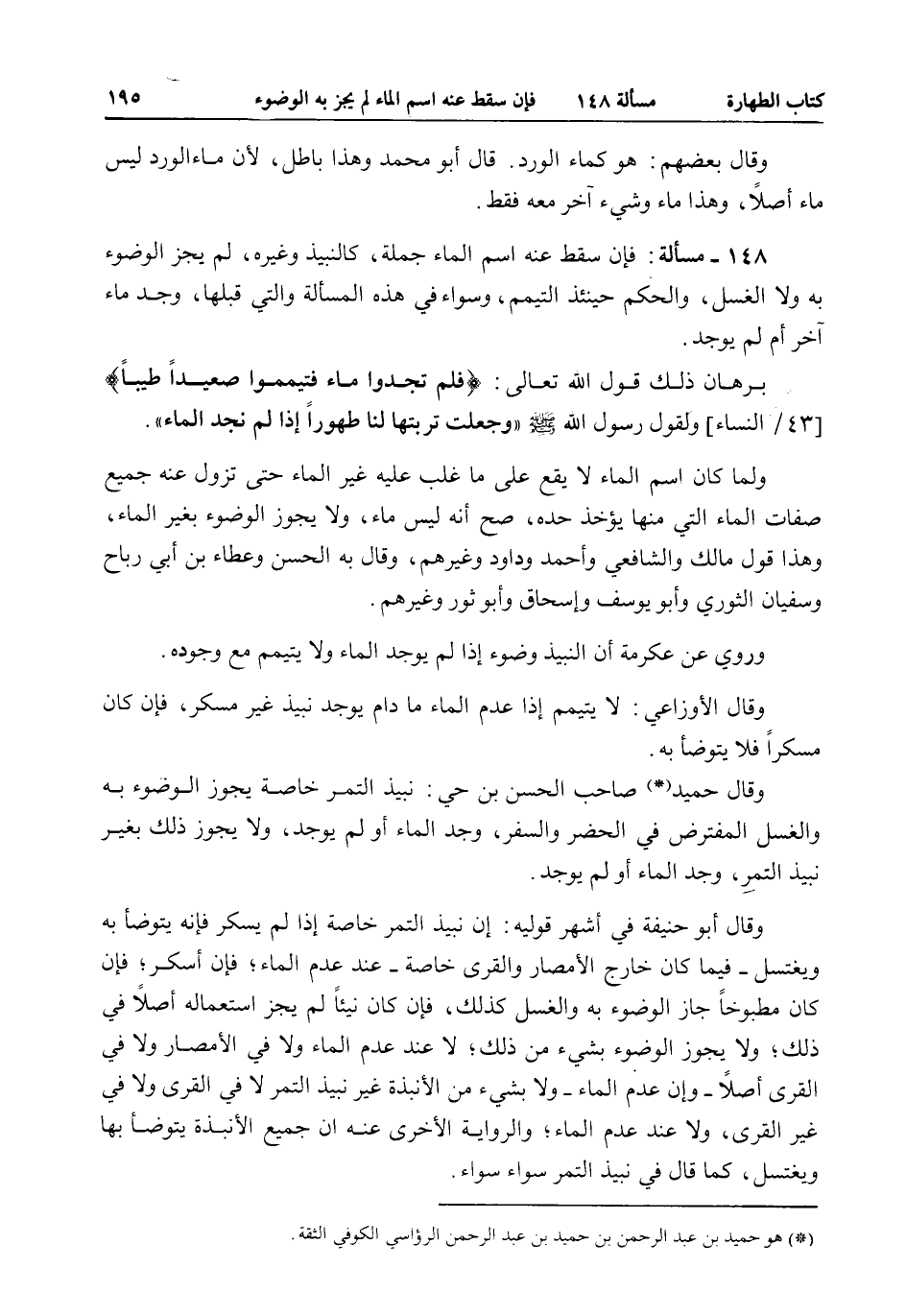 وَقَالَ حُمَيْدٌ صَاحِبُ الْحَسَنِ بْنِ حَيٍّ: نَبِيذُ التَّمْرِ خَاصَّةً يَجُوزُ الْوُضُوءُ بِهِ وَالْغُسْلُ الْمُفْتَرَضُ فِي الْحَضَرِ وَالسَّفَرِ، وُجِدَ الْمَاءُ أَوْ لَمْ يُوجَدْ، وَلَا يَجُوزُ ذَلِكَ بِغَيْرِ نَبِيذِ التَّمْرِ، وُجِدَ الْمَاءُ أَوْ لَمْ يُوجَدْ.