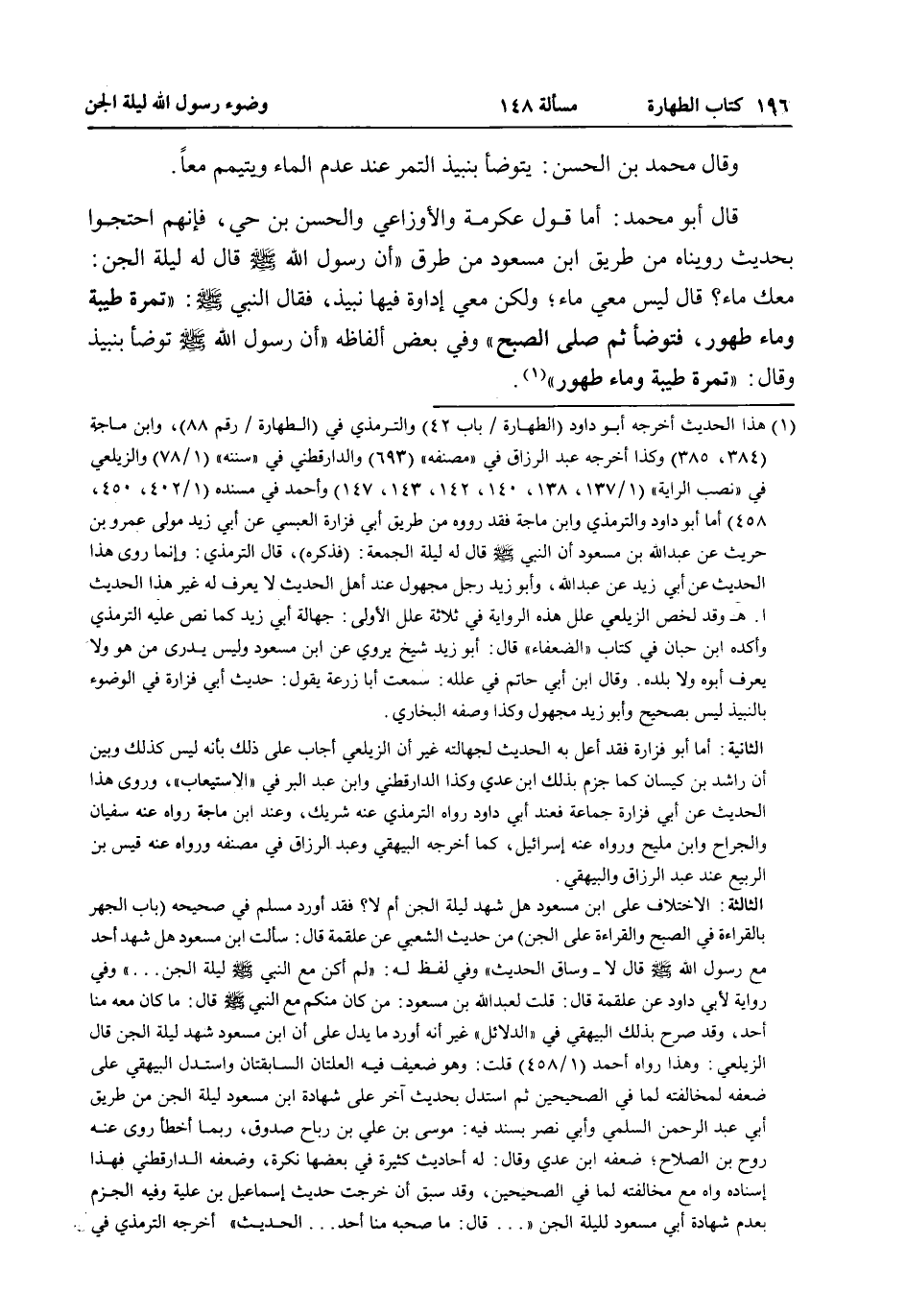 قَالَ أَبُو مُحَمَّدٍ: أَمَّا قَوْلُ عِكْرِمَةَ وَالْأَوْزَاعِيِّ وَالْحَسَنِ بْنِ حَيٍّ، فَإِنَّهُمْ احْتَجُّوا بِحَدِيثٍ رُوِّينَاهُ مِنْ طَرِيقِ ابْنِ مَسْعُودٍ مِنْ طُرُقٍ «أَنَّ رَسُولَ اللَّهِ - صَلَّى اللَّهُ عَلَيْهِ وَسَلَّمَ - قَالَ لَهُ لَيْلَةَ الْجِنِّ: مَعَكَ مَاءٌ؟ قَالَ لَيْسَ مَعِي مَاءٌ، وَلَكِنْ مَعِي إدَاوَةً فِيهَا نَبِيذٌ، فَقَالَ النَّبِيُّ - صَلَّى اللَّهُ عَلَيْهِ وَسَلَّمَ -: تَمْرَةٌ طَيِّبَةٌ وَمَاءٌ طَهُورٌ، فَتَوَضَّأَ ثُمَّ صَلَّى الصُّبْحَ» وَفِي بَعْضِ أَلْفَاظِهِ «أَنَّ رَسُولَ اللَّهِ - صَلَّى اللَّهُ عَلَيْهِ وَسَلَّمَ - تَوَضَّأَ بِنَبِيذٍ وَقَالَ: تَمْرَةٌ طَيِّبَةٌ وَمَاءٌ طَهُورٌ» .