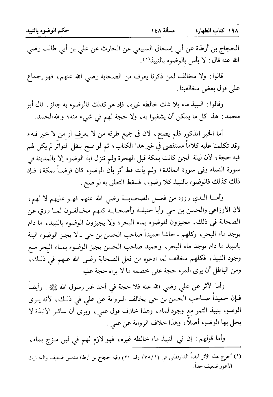 الْحَجَّاجُ بْنُ أَرْطَاةَ عَنْ أَبِي إِسْحَاقَ السَّبِيعِيِّ عَنْ الْحَارِثِ عَنْ عَلِيِّ بْنِ أَبِي طَالِبٍ - رَضِيَ اللَّهُ عَنْهُ - قَالَ: لَا بَأْسَ بِالْوُضُوءِ بِالنَّبِيذِ. قَالُوا: وَلَا مُخَالِفَ لِمَنْ ذَكَرْنَا يُعْرَفُ مِنْ الصَّحَابَةِ - رَضِيَ اللَّهُ عَنْهُمْ -، فَهُوَ إجْمَاعٌ عَلَى قَوْلِ بَعْضِ مُخَالِفِينَا.