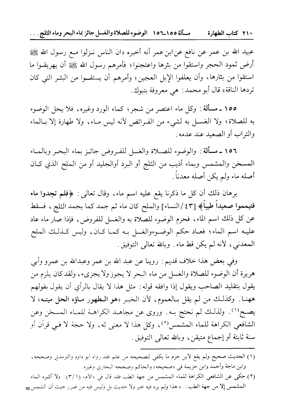 156 - مَسْأَلَةٌ: وَالْوُضُوءُ لِلصَّلَاةِ وَالْغُسْلُ لِلْفُرُوضِ جَائِزٌ بِمَاءِ الْبَحْرِ وَبِالْمَاءِ الْمُسَخَّنِ وَالْمُشَمَّسِ وَبِمَاءٍ أُذِيبَ مِنْ الثَّلْجِ أَوْ الْبَرَدِ أَوْ الْجَلِيدِ أَوْ مِنْ الْمِلْحِ الَّذِي كَانَ أَصْلُهُ مَاءً وَلَمْ يَكُنْ أَصْلُهُ مَعْدِنًا. بُرْهَانُ ذَلِكَ أَنَّ كُلَّ مَا ذَكَرْنَا يَقَعُ عَلَيْهِ اسْمُ مَاءٍ، وَقَالَ تَعَالَى: {فَلَمْ تَجِدُوا مَاءً فَتَيَمَّمُوا صَعِيدًا طَيِّبًا} [النساء: 43] وَالْمِلْحُ كَانَ مَاءً ثُمَّ جَمَدَ كَمَا يَجْمُدُ الثَّلْجُ، فَسَقَطَ عَنْ كُلِّ ذَلِكَ اسْمُ الْمَاءِ، فَحَرُمَ الْوُضُوءُ لِلصَّلَاةِ بِهِ وَالْغُسْلُ لِلْفُرُوضِ، فَإِذَا صَارَ مَاءً عَادَ عَلَيْهِ اسْمُ الْمَاءِ، فَعَادَ حُكْمُ الْوُضُوءِ وَالْغُسْلِ بِهِ كَمَا كَانَ، وَلَيْسَ كَذَلِكَ الْمِلْحُ الْمَعْدِنِيُّ، لِأَنَّهُ لَمْ يَكُنْ قَطُّ مَاءً. وَبِاَللَّهِ تَعَالَى التَّوْفِيقُ.