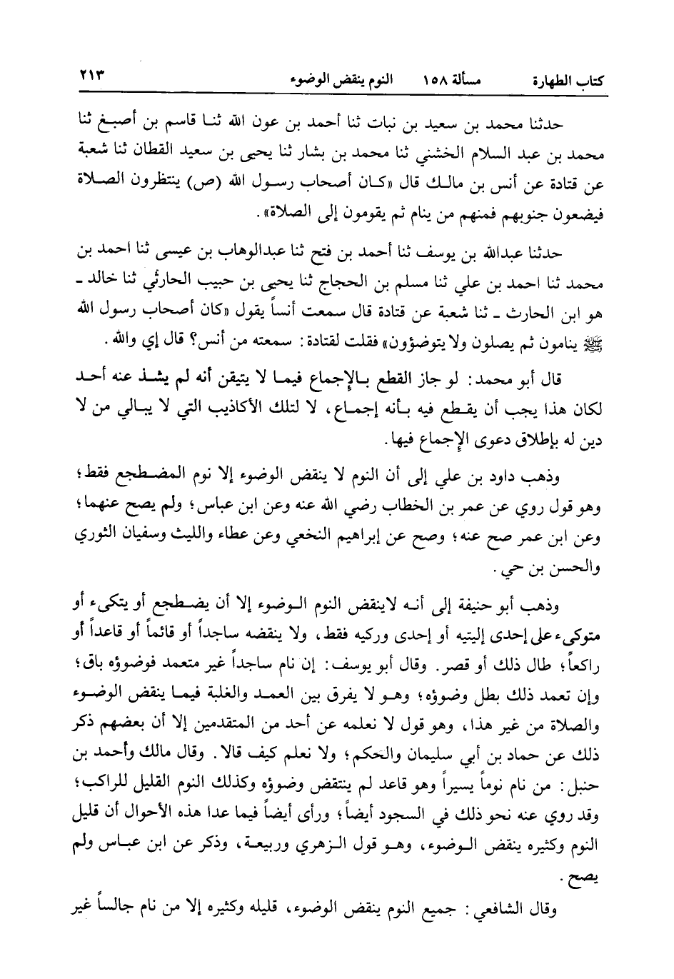 حَدَّثَنَا عَبْدُ اللَّهِ بْنُ يُوسُفَ ثنا أَحْمَدُ بْنُ فَتْحٍ ثنا عَبْدُ الْوَهَّابِ بْنُ عِيسَى ثنا أَحْمَدُ بْنُ مُحَمَّدٍ ثنا أَحْمَدُ بْنُ عَلِيٍّ ثنا مُسْلِمُ بْنُ الْحَجَّاجِ ثنا يَحْيَى بْنُ حَبِيبٍ الْحَارِثِيُّ ثنا خَالِدٌ هُوَ ابْنُ الْحَارِثِ - ثنا شُعْبَةُ عَنْ قَتَادَةَ قَالَ سَمِعْت أَنَسًا يَقُولُ " كَانَ أَصْحَابُ رَسُولِ اللَّهِ - صَلَّى اللَّهُ عَلَيْهِ وَسَلَّمَ - يَنَامُونَ ثُمَّ يُصَلُّونَ وَلَا يَتَوَضَّئُونَ " فَقُلْت لِقَتَادَةَ: سَمِعْته مِنْ أَنَسٍ؟ قَالَ إي وَاَللَّهِ. قَالَ أَبُو مُحَمَّدٍ: لَوْ جَازَ الْقَطْعُ بِالْإِجْمَاعِ فِيمَا لَا يُتَيَقَّنُ أَنَّهُ لَمْ يَشِذَّ عَنْهُ أَحَدٌ لَكَانَ هَذَا يَجِبُ أَنْ يُقْطَعَ فِيهِ بِأَنَّهُ إجْمَاعٌ، لَا لِتِلْكَ الْأَكَاذِيبِ الَّتِي لَا يُبَالِي مَنْ لَا دِينَ لَهُ بِإِطْلَاقِ دَعْوَى الْإِجْمَاعِ فِيهَا. وَذَهَبَ دَاوُد بْنُ عَلِيٍّ إلَى أَنَّ النَّوْمَ لَا يَنْقُضُ الْوُضُوءَ إلَّا نَوْمَ الْمُضْطَجِعِ فَقَطْ، وَهُوَ قَوْلٌ رُوِيَ عَنْ عُمَرَ بْنِ الْخَطَّابِ - رَضِيَ اللَّهُ عَنْهُ - وَعَنْ ابْنِ عَبَّاسٍ، وَلَمْ يَصِحَّ عَنْهُمَا، وَعَنْ ابْنِ عُمَرَ صَحَّ عَنْهُ، وَصَحَّ عَنْ إبْرَاهِيمَ النَّخَعِيِّ وَعَنْ عَطَاءٍ وَاللَّيْثِ وَسُفْيَانَ الثَّوْرِيِّ وَالْحَسَنِ بْنِ حَيٍّ. وَذَهَبَ أَبُو حَنِيفَةَ إلَى أَنَّهُ لَا يَنْقُضُ النَّوْمُ الْوُضُوءَ إلَّا أَنْ يَضْطَجِعَ أَوْ يَتَّكِئَ أَوْ مُتَوَكِّئًا عَلَى إحْدَى أَلْيَتَيْهِ أَوْ إحْدَى وَرِكَيْهِ فَقَطْ، وَلَا يَنْقُضُهُ سَاجِدًا أَوْ قَائِمًا أَوْ قَاعِدًا أَوْ رَاكِعًا، طَالَ ذَلِكَ أَوْ قَصُرَ. وَقَالَ أَبُو يُوسُفَ: إنْ نَامَ سَاجِدًا غَيْرَ مُتَعَمِّدٍ فَوُضُوءُهُ بَاقٍ، وَإِنْ تَعَمَّدَ ذَلِكَ بَطَلَ وُضُوءُهُ، وَهُوَ لَا يُفَرِّقُ بَيْنَ الْعَمْدِ وَالْغَلَبَةِ فِيمَا يَنْقُضُ الْوُضُوءَ وَالصَّلَاةَ مِنْ غَيْرِ هَذَا، وَهُوَ قَوْلٌ لَا نَعْلَمُهُ عَنْ أَحَدٍ مِنْ الْمُتَقَدِّمِينَ إلَّا أَنَّ بَعْضَهُمْ ذَكَرَ ذَلِكَ عَنْ حَمَّادِ بْنِ أَبِي سُلَيْمَانَ وَالْحَكَمِ، وَلَا نَعْلَمُ كَيْفَ قَالَا.