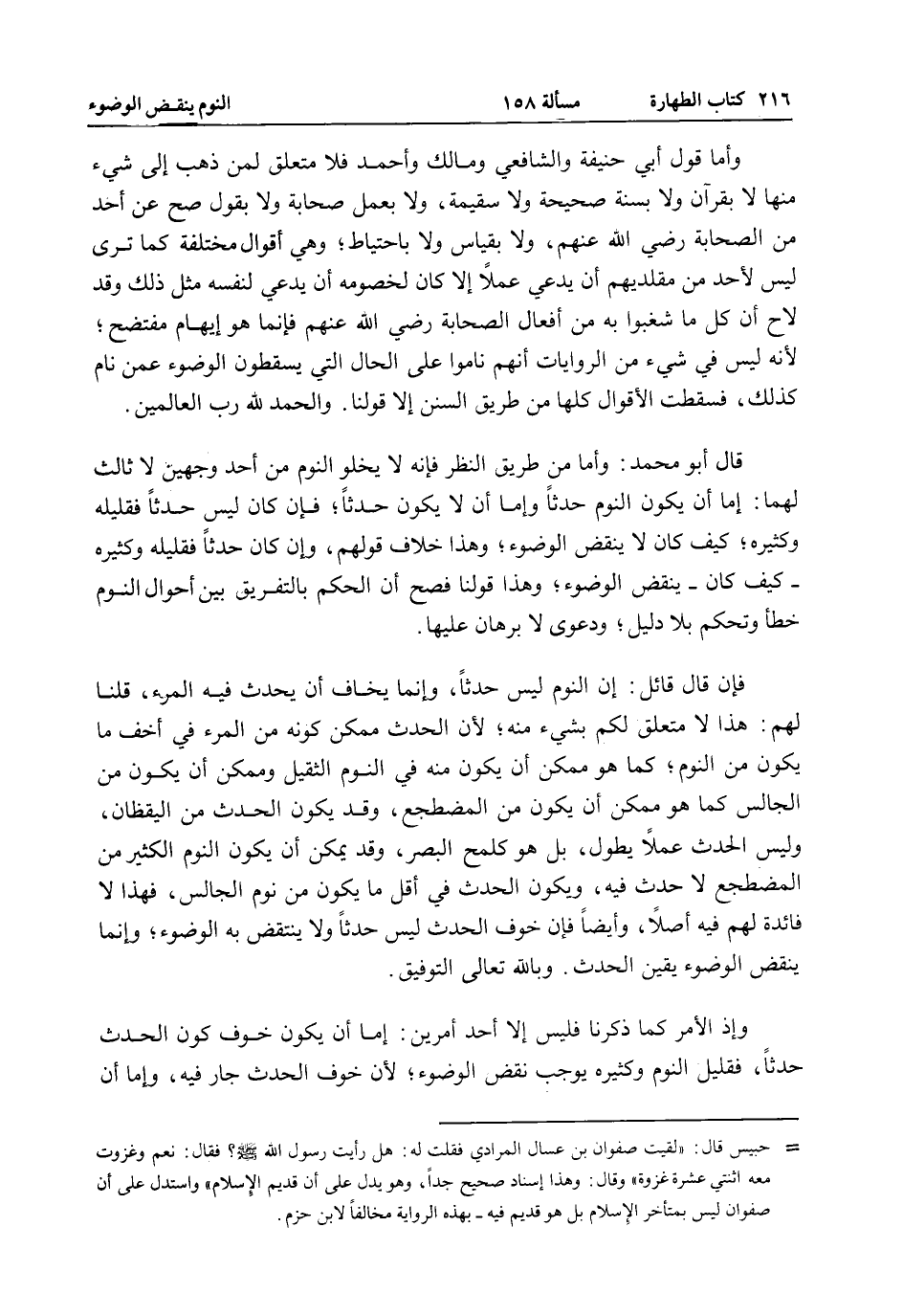 وَأَمَّا قَوْلُ أَبِي حَنِيفَةَ وَالشَّافِعِيِّ وَمَالِكٍ وَأَحْمَدَ فَلَا مُتَعَلَّقَ لِمَنْ ذَهَبَ إلَى شَيْءٍ مِنْهَا لَا بِقُرْآنٍ وَلَا بِسُنَّةٍ صَحِيحَةٍ وَلَا سَقِيمَةٍ، وَلَا بِعَمَلِ صَحَابَةٍ وَلَا بِقَوْلٍ صَحَّ عَنْ أَحَدٍ مِنْ الصَّحَابَةِ - رَضِيَ اللَّهُ عَنْهُمْ -، وَلَا بِقِيَاسٍ وَلَا بِاحْتِيَاطٍ، وَهِيَ أَقْوَالٌ مُخْتَلِفَةٌ كَمَا تَرَى لَيْسَ لِأَحَدٍ مِنْ مُقَلِّدِيهِمْ أَنْ يَدَّعِيَ عَمَلًا إلَّا كَانَ لِخُصُومِهِ أَنْ يَدَّعِيَ لِنَفْسِهِ مِثْلَ ذَلِكَ وَقَدْ لَاحَ أَنَّ كُلَّ مَا شَغَبُوا بِهِ مِنْ أَفْعَالِ الصَّحَابَةِ - رَضِيَ اللَّهُ عَنْهُمْ - فَإِنَّمَا هُوَ إيهَامٌ مُفْتَضَحٌ، لِأَنَّهُ لَيْسَ فِي شَيْءٍ مِنْ الرِّوَايَاتِ أَنَّهُمْ نَامُوا عَلَى الْحَالِ الَّتِي يُسْقِطُونَ الْوُضُوءَ عَمَّنْ نَامَ كَذَلِكَ، فَسَقَطَتْ الْأَقْوَالُ كُلُّهَا مِنْ طَرِيقِ السُّنَنِ إلَّا قَوْلَنَا. وَالْحَمْدُ لِلَّهِ رَبِّ الْعَالَمِينَ.