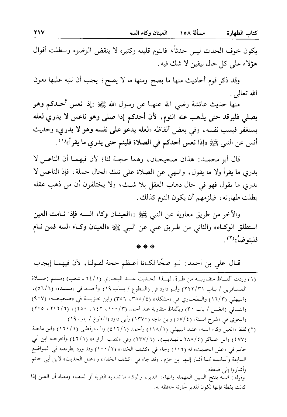 يَكُونَ خَوْفَ الْحَدَثِ لَيْسَ حَدَثًا، فَالنَّوْمُ قَلِيلُهُ وَكَثِيرُهُ لَا يَنْقُضُ الْوُضُوءَ وَبَطَلَتْ أَقْوَالُ هَؤُلَاءِ عَلَى كُلِّ حَالٍ بِيَقِينٍ لَا شَكَّ فِيهِ. وَقَدْ ذَكَرَ قَوْمٌ أَحَادِيثَ مِنْهَا مَا يَصِحُّ وَمِنْهَا مَا لَا يَصِحُّ، يَجِبُ أَنْ نُنَبِّهَ عَلَيْهَا بِعَوْنِ اللَّهِ تَعَالَى. مِنْهَا حَدِيثُ عَائِشَةَ - رَضِيَ اللَّهُ عَنْهَا - عَنْ رَسُولِ اللَّهِ - صَلَّى اللَّهُ عَلَيْهِ وَسَلَّمَ - «إذَا نَعَسَ أَحَدُكُمْ وَهُوَ يُصَلِّي فَلْيَرْقُدْ حَتَّى يَذْهَبَ عَنْهُ النَّوْمُ؛ لِأَنَّ أَحَدَكُمْ إذَا صَلَّى وَهُوَ نَاعِسٌ لَا يَدْرِي لَعَلَّهُ يَسْتَغْفِرُ فَيَسُبَّ نَفْسَهُ» ، وَفِي بَعْضِ أَلْفَاظِهِ «لَعَلَّهُ يَدْعُو عَلَى نَفْسِهِ وَهُوَ لَا يَدْرِي» وَحَدِيثُ أَنَسٍ عَنْ النَّبِيِّ - صَلَّى اللَّهُ عَلَيْهِ وَسَلَّمَ - «إذَا نَعَسَ أَحَدُكُمْ فِي الصَّلَاةِ فَلْيَنَمْ حَتَّى يَدْرِيَ مَا يَقْرَأُ» . قَالَ أَبُو مُحَمَّدٍ: هَذَانِ صَحِيحَانِ، وَهُمَا حُجَّةٌ لَنَا، لِأَنَّ فِيهِمَا أَنَّ النَّاعِسَ لَا يَدْرِي مَا يَقْرَأُ وَلَا مَا يَقُولُ، وَالنَّهْيُ عَنْ الصَّلَاةِ عَلَى تِلْكَ الْحَالِ جُمْلَةً، فَإِذْ النَّاعِسُ لَا يَدْرِي مَا يَقُولُ فَهُوَ فِي حَالِ ذَهَابِ الْعَقْلِ بِلَا شَكٍّ، وَلَا يَخْتَلِفُونَ أَنَّ مَنْ ذَهَبَ عَقْلُهُ بَطَلَتْ طَهَارَتُهُ، فَيَلْزَمُهُمْ أَنْ يَكُونَ النَّوْمُ كَذَلِكَ. وَالْآخَرُ مِنْ طَرِيقِ مُعَاوِيَةَ عَنْ النَّبِيِّ - صَلَّى اللَّهُ عَلَيْهِ وَسَلَّمَ - «الْعَيْنَانِ وِكَاءُ السَّهِ فَإِذَا نَامَتْ الْعَيْنُ اسْتَطْلَقَ الْوِكَاءُ» وَالثَّانِي مِنْ طَرِيقِ عَلِيٍّ عَنْ النَّبِيّ - صَلَّى اللَّهُ عَلَيْهِ وَسَلَّمَ - «الْعَيْنَانِ وِكَاءُ السَّهِ فَمَنْ نَامَ فَلْيَتَوَضَّأْ» .