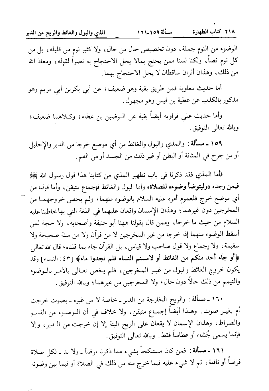 159 - مَسْأَلَةٌ: وَالْمَذْيُ وَالْبَوْلُ وَالْغَائِطُ مِنْ أَيْ مَوْضِعٍ خَرَجَ مِنْ الدُّبُرِ وَالْإِحْلِيلِ أَوْ مِنْ جُرْحٍ فِي الْمَثَانَةِ أَوْ الْبَطْنِ أَوْ غَيْرِ ذَلِكَ مِنْ الْجَسَدِ أَوْ مِنْ الْفَمِ.