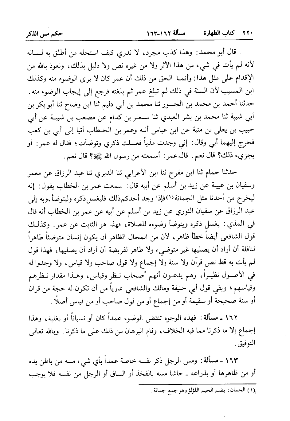 حَدَّثَنَا حُمَامٌ ثنا ابْنُ مُفَرِّحٍ ثنا ابْنُ الْأَعْرَابِيِّ ثنا الدَّبَرِيُّ ثنا عَبْدُ الرَّزَّاقِ عَنْ مَعْمَرٍ وَسُفْيَانُ بْنُ عُيَيْنَةَ عَنْ زَيْدِ بْنِ أَسْلَمَ عَنْ أَبِيهِ قَالَ: سَمِعْت عُمَرَ بْنَ الْخَطَّابِ يَقُولُ: إنَّهُ لَيَخْرُجُ مِنْ أَحَدِنَا مِثْلُ الْجُمَانَةِ فَإِذَا وَجَدَ أَحَدُكُمْ ذَلِكَ فَلْيَغْسِلْ ذَكَرَهُ وَلْيَتَوَضَّأْ، وَبِهِ إلَى عَبْدِ الرَّزَّاقِ عَنْ سُفْيَانَ الثَّوْرِيِّ عَنْ زَيْدِ بْنِ أَسْلَمَ عَنْ أَبِيهِ عَنْ عُمَرَ بْنِ الْخَطَّابِ أَنَّهُ قَالَ فِي الْمَذْيِ: يَغْسِلُ ذَكَرَهُ وَيَتَوَضَّأُ وُضُوءَهُ لِلصَّلَاةِ، فَهَذَا هُوَ الثَّابِتُ عَنْ عُمَرَ. وَكَذَلِكَ قَوْلُ الشَّافِعِيِّ أَيْضًا خَطَأٌ ظَاهِرٌ؛ لِأَنَّ مِنْ الْمُحَالِ الظَّاهِرِ أَنْ يَكُونَ إنْسَانٌ مُتَوَضِّئًا طَاهِرًا لِنَافِلَةٍ إنْ أَرَادَ أَنْ يُصَلِّيَهَا غَيْرَ مُتَوَضِّئٍ وَلَا طَاهِرٍ لِفَرِيضَةِ إنْ أَرَادَ أَنْ يُصَلِّيَهَا، فَهَذَا قَوْلٌ لَمْ يَأْتِ بِهِ قَطُّ نَصُّ قُرْآنٍ وَلَا سُنَّةٍ وَلَا إجْمَاعٍ وَلَا قَوْلِ صَاحِبٍ وَلَا قِيَاسٍ، وَلَا وَجَدُوا لَهُ فِي الْأُصُولِ نَظِيرًا، وَهُمْ يَدَّعُونَ أَنَّهُمْ أَصْحَابُ نَظَرٍ وَقِيَاسٍ، وَهَذَا مِقْدَارُ نَظَرِهِمْ وَقِيَاسِهِمْ، وَبَقِيَ قَوْلُ أَبِي حَنِيفَةَ وَمَالِكٍ وَالشَّافِعِيِّ عَارِيًّا مِنْ أَنْ تَكُونُ لَهُ حُجَّةٌ مِنْ قُرْآنٍ أَوْ سُنَّةٍ صَحِيحَةٍ أَوْ سَقِيمَةٍ أَوْ مِنْ إجْمَاعٍ أَوْ مِنْ قَوْلِ صَاحِبٍ أَوْ مِنْ قِيَاسٍ أَصْلًا 162 - مَسْأَلَةٌ: فَهَذِهِ الْوُجُوهُ تَنْقُضُ الْوُضُوءَ عَمْدًا كَانَ أَوْ نِسْيَانًا أَوْ بِغَلَبَةٍ، وَهَذَا إجْمَاعٌ إلَّا مَا ذَكَرْنَا مِمَّا فِيهِ الْخِلَافُ، وَقَامَ الْبُرْهَانُ مِنْ ذَلِكَ عَلَى مَا ذَكَرْنَا. وَبِاَللَّهِ تَعَالَى التَّوْفِيقُ.