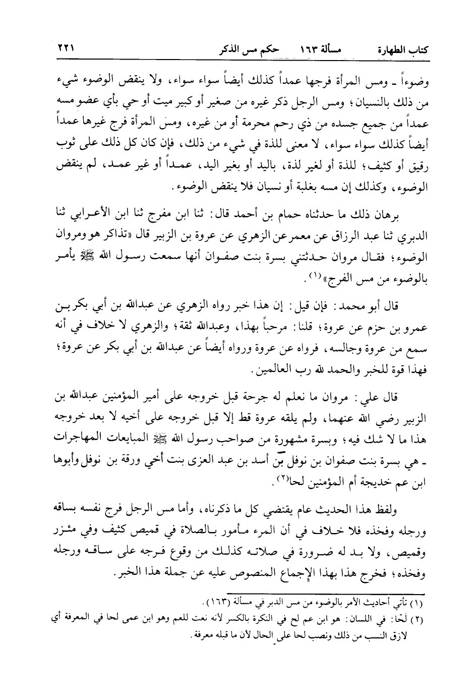 قَالَ أَبُو مُحَمَّدٍ: فَإِنْ قِيلَ: إنَّ هَذَا خَبَرٌ رَوَاهُ الزُّهْرِيُّ عَنْ عَبْدِ اللَّهِ بْنِ أَبِي بَكْرِ بْنِ عَمْرِو بْنِ حَزْمٍ عَنْ عُرْوَةَ، قُلْنَا: مَرْحَبًا بِهَذَا، وَعَبْدُ اللَّهِ ثِقَةٌ، وَالزُّهْرِيُّ لَا خِلَافَ فِي أَنَّهُ سَمِعَ مِنْ عُرْوَةَ وَجَالَسَهُ، فَرَوَاهُ عَنْ عُرْوَةَ وَرَوَاهُ أَيْضًا عَنْ عَبْدِ اللَّهِ بْنِ أَبِي بَكْرٍ عَنْ عُرْوَةَ، فَهَذَا قُوَّةٌ لِلْخَبَرِ وَالْحَمْدُ لِلَّهِ رَبِّ الْعَالَمِينَ. قَالَ عَلِيٌّ: مَرْوَانُ مَا نَعْلَمُ لَهُ جُرْحَةً قَبْلَ خُرُوجِهِ عَلَى أَمِيرِ الْمُؤْمِنِينَ عَبْدِ اللَّهِ بْنِ الزُّبَيْرِ - رَضِيَ اللَّهُ عَنْهُمَا -، وَلَمْ يَلْقَهُ عُرْوَةُ قَطُّ إلَّا قَبْلَ خُرُوجِهِ عَلَى أَخِيهِ لَا بَعْدَ خُرُوجِهِ هَذَا مَا لَا شَكَّ فِيهِ، وَبُسْرَةُ مَشْهُورَةٌ مِنْ صَوَاحِبِ رَسُولِ اللَّهِ - صَلَّى اللَّهُ عَلَيْهِ وَسَلَّمَ - الْمُبَايِعَاتِ الْمُهَاجِرَاتِ - هِيَ بُسْرَةُ بِنْتُ صَفْوَانَ بْنِ نَوْفَلِ بْنِ أَسَدِ بْنِ عَبْدِ الْعُزَّى بِنْتُ أَخِي وَرَقَةَ بْنِ نَوْفَلٍ وَأَبُوهَا ابْنُ عَمِّ خَدِيجَةَ أُمِّ الْمُؤْمِنِينَ لَحًّا.