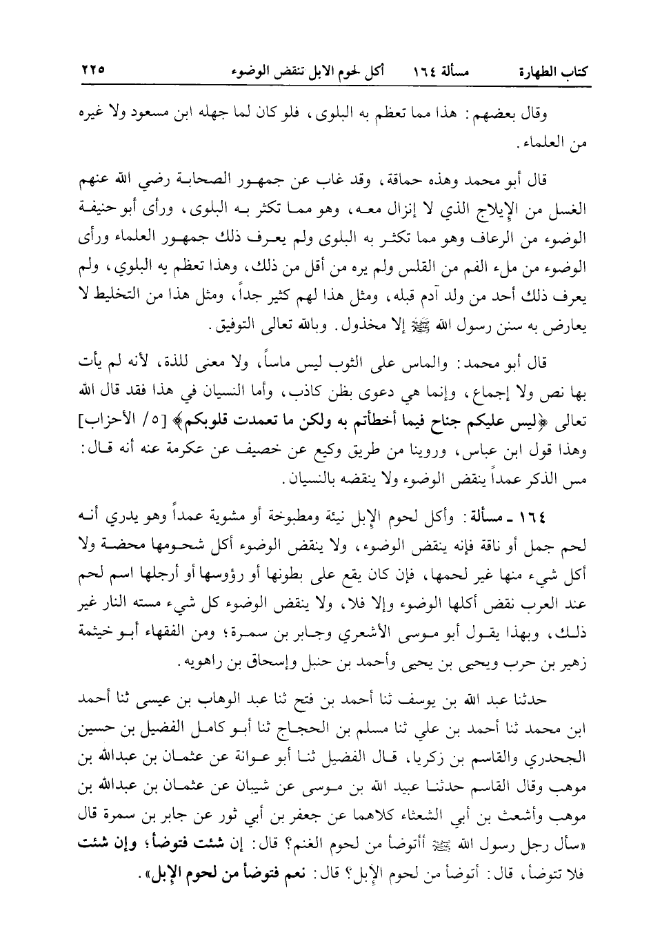 . 164 - مَسْأَلَةٌ: وَأَكْلُ لُحُومِ الْإِبِلِ نِيئَةً وَمَطْبُوخَةً أَوْ مَشْوِيَّةً عَمْدًا وَهُوَ يَدْرِي أَنَّهُ لَحْمُ جَمَلٍ أَوْ نَاقَةٍ فَإِنَّهُ يَنْقُضُ الْوُضُوءَ، وَلَا يَنْقُضُ الْوُضُوءَ أَكْلُ شُحُومِهَا مَحْضَةً وَلَا أَكْلُ شَيْءٍ مِنْهَا غَيْرَ لَحْمِهَا، فَإِنْ كَانَ يَقَعُ عَلَى بُطُونِهَا أَوْ رُءُوسِهَا أَوْ أَرْجُلِهَا اسْمُ لَحْمٍ عِنْدَ الْعَرَبِ نَقَضَ أَكْلُهَا الْوُضُوءَ وَإِلَّا فَلَا، وَلَا يَنْقُضُ الْوُضُوءَ كُلُّ شَيْءٍ مَسَّتْهُ النَّارُ غَيْرَ ذَلِكَ، وَبِهَذَا يَقُولُ أَبُو مُوسَى الْأَشْعَرِيُّ وَجَابِرُ بْنُ سَمُرَةَ، وَمِنْ الْفُقَهَاءِ أَبُو خَيْثَمَةَ زُهَيْرُ بْنُ حَرْبٍ وَيَحْيَى بْنُ يَحْيَى وَأَحْمَدُ بْنُ حَنْبَلٍ وَإِسْحَاقُ بْنُ رَاهْوَيْهِ. حَدَّثَنَا عَبْدُ اللَّهِ بْنُ يُوسُفَ ثنا أَحْمَدُ بْنُ فَتْحٍ ثنا عَبْدُ الْوَهَّابِ بْنُ عِيسَى ثنا أَحْمَدُ بْنُ مُحَمَّدٍ ثنا أَحْمَدُ بْنُ عَلِيٍّ ثنا مُسْلِمُ بْنُ الْحَجَّاجِ ثنا أَبُو كَامِلٍ الْفُضَيْلِ بْنِ حُسَيْنٍ الْجَحْدَرِيُّ وَالْقَاسِمُ بْنُ زَكَرِيَّا، قَالَ الْفُضَيْلُ ثنا أَبُو عَوَانَةَ عَنْ عُثْمَانَ بْنِ عَبْدِ اللَّهِ بْنِ مَوْهَبٍ وَقَالَ الْقَاسِمُ حَدَّثَنَا عُبَيْدُ اللَّهِ بْنُ مُوسَى عَنْ شَيْبَانَ عَنْ عُثْمَانَ بْنِ عَبْدِ اللَّهِ بْنِ مَوْهَبٍ وَأَشْعَثُ بْنُ أَبِي الشَّعْثَاءِ كِلَاهُمَا عَنْ جَعْفَرِ بْنِ أَبِي ثَوْرٍ عَنْ جَابِرِ بْنِ سَمُرَةَ قَالَ «سَأَلَ رَجُلٌ رَسُولَ اللَّهِ - صَلَّى اللَّهُ عَلَيْهِ وَسَلَّمَ - أَأَتَوَضَّأُ مِنْ لُحُومِ الْغَنَمِ؟ قَالَ: إنْ شِئْت فَتَوَضَّأْ، وَإِنْ شِئْت فَلَا تَتَوَضَّأْ، قَالَ: أَتَوَضَّأُ مِنْ لُحُومِ الْإِبِلِ؟ قَالَ: نَعَمْ فَتَوَضَّأْ مِنْ لُحُومِ الْإِبِلِ» .