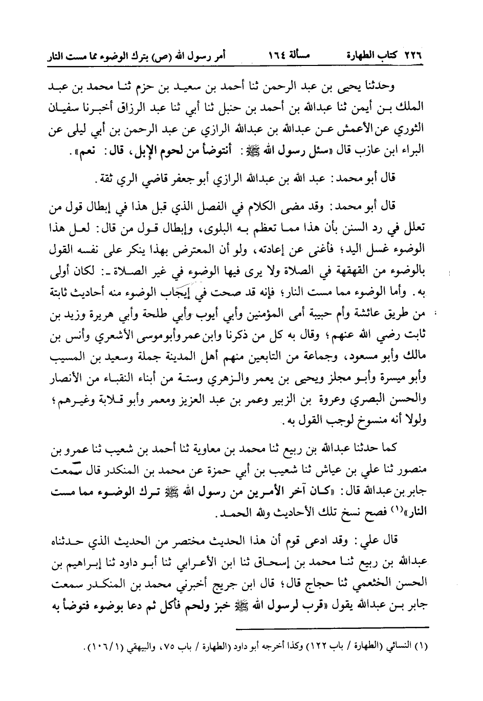 وَحَدَّثَنَا يَحْيَى بْنُ عَبْدِ الرَّحْمَنِ ثنا أَحْمَدُ بْنُ سَعِيدِ بْنِ حَزْمٍ ثنا مُحَمَّدُ بْنُ عَبْدِ الْمَلِكِ بْنُ أَيْمَنَ ثنا عَبْدُ اللَّهِ بْنُ أَحْمَدَ بْنِ حَنْبَلٍ ثنا أَبِي ثنا عَبْدُ الرَّزَّاقِ أَخْبَرَنَا سُفْيَانُ الثَّوْرِيُّ عَنْ الْأَعْمَشِ عَنْ عَبْدِ اللَّهِ بْنِ عَبْدِ اللَّهِ الرَّازِيّ عَنْ عَبْدِ الرَّحْمَنِ بْنِ أَبِي لَيْلَى عَنْ الْبَرَاءِ بْنِ عَازِبٍ قَالَ «سُئِلَ رَسُولُ اللَّهِ - صَلَّى اللَّهُ عَلَيْهِ وَسَلَّمَ -: أَنَتَوَضَّأُ مِنْ لُحُومِ الْإِبِلِ، قَالَ: نَعَمْ» . قَالَ أَبُو مُحَمَّدٍ: عَبْدُ اللَّهِ بْنُ عَبْدِ اللَّهِ الرَّازِيّ أَبُو جَعْفَرٍ قَاضِي الرَّيِّ ثِقَةٌ.