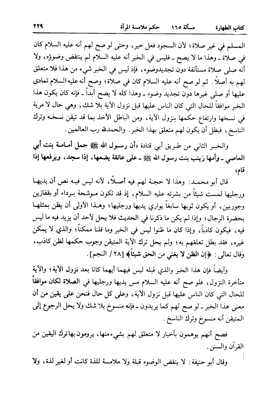 وَأَيْضًا فَإِنَّ هَذَا الْخَبَرَ وَاَلَّذِي قَبْلَهُ لَيْسَ فِيهِمَا أَيَّهُمَا كَانَ بَعْدَ نُزُولِ الْآيَةِ، وَالْآيَةُ مُتَأَخِّرَةُ النُّزُولِ، فَلَوْ صَحَّ أَنَّهُ - عَلَيْهِ السَّلَامُ - مَسَّ يَدَيْهَا وَرِجْلَيْهَا فِي الصَّلَاةِ لَكَانَ مُوَافِقًا لِلْحَالِ الَّتِي كَانَ النَّاسُ عَلَيْهَا قَبْلَ نُزُولِ الْآيَةِ، وَعَلَى كُلِّ حَالٍ فَنَحْنُ عَلَى يَقِينٍ مِنْ أَنَّ مَعْنَى هَذَا الْخَبَرِ - لَوْ صَحَّ لَهُمْ كَمَا يُرِيدُونَ - فَإِنَّهُ مَنْسُوخٌ بِلَا شَكٍّ وَلَا يَحِلُّ الرُّجُوعُ إلَى الْمُتَيَقَّنِ أَنَّهُ مَنْسُوخٌ وَتَرْكُ النَّاسِخِ. فَصَحَّ أَنَّهُمْ يُوهَمُونَ بِأَخْبَارٍ لَا مُتَعَلِّقَ لَهُمْ بِشَيْءٍ مِنْهَا، يَرُومُونَ بِهَا تَرْكَ الْيَقِينِ مِنْ الْقُرْآنِ وَالسُّنَنِ.