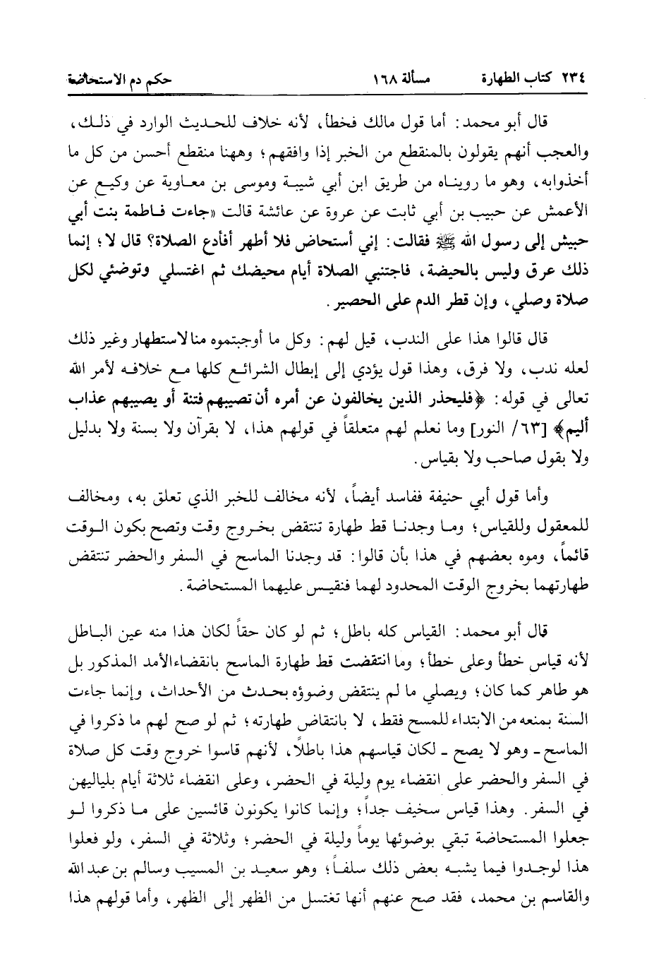 قَالَ: قَالُوا هَذَا عَلَى النَّدْبِ، قِيلَ لَهُمْ: وَكُلُّ مَا أَوْجَبْتُمُوهُ مِنَّا لِاسْتِطْهَارٍ وَغَيْرِ ذَلِكَ لَعَلَّهُ نَدْبٌ، وَلَا فَرْقَ، وَهَذَا قَوْلٌ يُؤَدِّي إلَى إبْطَالِ الشَّرَائِعِ كُلِّهَا مَعَ خِلَافِهِ لِأَمْرِ اللَّهِ تَعَالَى فِي قَوْلِهِ: {فَلْيَحْذَرِ الَّذِينَ يُخَالِفُونَ عَنْ أَمْرِهِ أَنْ تُصِيبَهُمْ فِتْنَةٌ أَوْ يُصِيبَهُمْ عَذَابٌ أَلِيمٌ} [النور: 63] وَمَا نَعْلَمُ لَهُمْ مُتَعَلَّقًا فِي قَوْلِهِمْ هَذَا، لَا بِقُرْآنٍ وَلَا بِسُنَّةٍ وَلَا بِدَلِيلٍ وَلَا بِقَوْلِ صَاحِبٍ وَلَا بِقِيَاسٍ. وَأَمَّا قَوْلُ أَبِي حَنِيفَةَ فَفَاسِدٌ أَيْضًا لِأَنَّهُ مُخَالِفٌ لِلْخَبَرِ الَّذِي تَعَلَّقَ بِهِ، وَمُخَالِفٌ لِلْمَعْقُولِ وَلِلْقِيَاسِ، وَمَا وَجَدْنَا قَطُّ طَهَارَةً تَنْتَقِضُ بِخُرُوجِ وَقْتٍ وَتَصِحُّ بِكَوْنِ الْوَقْتِ قَائِمًا، وَمَوَّهَ بَعْضُهُمْ فِي هَذَا بِأَنْ قَالُوا: قَدْ وَجَدْنَا الْمَاسِحَ فِي السَّفَرِ وَالْحَضَرِ تَنْتَقِضُ طَهَارَتُهُمَا بِخُرُوجِ الْوَقْتِ الْمَحْدُودِ لَهُمَا فَنَقِيسُ عَلَيْهِمَا الْمُسْتَحَاضَةَ. قَالَ أَبُو مُحَمَّدٍ: الْقِيَاسُ كُلُّهُ بَاطِلٌ، ثُمَّ لَوْ كَانَ حَقًّا لَكَانَ هَذَا مِنْهُ عَيْنَ الْبَاطِلِ؛ لِأَنَّهُ قِيَاسٌ خَطَأٌ وَعَلَى خَطَإٍ، وَمَا انْتَقَضَتْ قَطُّ طَهَارَةُ الْمَاسِحِ بِانْقِضَاءِ الْأَمَدِ الْمَذْكُورِ بَلْ هُوَ طَاهِرٌ كَمَا كَانَ، وَيُصَلِّي مَا لَمْ يَنْتَقِضْ وُضُوءُهُ بِحَدَثٍ مِنْ الْأَحْدَاثِ، وَإِنَّمَا جَاءَتْ السُّنَّةُ بِمَنْعِهِ مِنْ الِابْتِدَاءِ لِلْمَسْحِ فَقَطْ، لَا بِانْتِقَاضِ طَهَارَتِهِ، ثُمَّ لَوْ صَحَّ لَهُمْ مَا ذَكَرُوا فِي الْمَاسِحِ - وَهُوَ لَا يَصِحُّ - لَكَانَ قِيَاسُهُمْ هَذَا بَاطِلًا لِأَنَّهُمْ قَاسُوا خُرُوجَ وَقْتِ كُلِّ صَلَاةٍ فِي السَّفَرِ وَالْحَضَرِ عَلَى انْقِضَاءِ يَوْمٍ وَلَيْلَةٍ فِي الْحَضَرِ، وَعَلَى انْقِضَاءِ ثَلَاثَةِ أَيَّامٍ بِلَيَالِيِهِنَّ فِي السَّفَرِ. وَهَذَا قِيَاسٌ سَخِيفٌ جِدًّا، وَإِنَّمَا كَانُوا يَكُونُونَ قَائِسِينَ عَلَى مَا ذَكَرُوا لَوْ جَعَلُوا الْمُسْتَحَاضَةَ تَبْقَى بِوُضُوئِهَا يَوْمًا وَلَيْلَةً فِي الْحَضَرِ، وَثَلَاثَةً فِي السَّفَرِ، وَلَوْ فَعَلُوا هَذَا لَوَجَدُوا فِيمَا يُشْبِهُ بَعْضَ ذَلِكَ سَلَفًا، وَهُوَ سَعِيدُ بْنُ الْمُسَيِّبِ وَسَالِمُ بْنُ عَبْدِ اللَّهِ وَالْقَاسِمُ بْنُ مُحَمَّدٍ، فَقَدْ صَحَّ عَنْهُمْ أَنَّهَا تَغْتَسِلُ مِنْ الظُّهْرِ إلَى الظُّهْرِ، وَأَمَّا قَوْلُهُمْ هَذَا