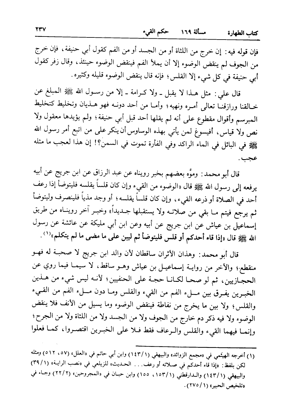 قَالَ أَبُو مُحَمَّدٍ: وَهَذَانِ الْأَثَرَانِ سَاقِطَانِ؛ لِأَنَّ وَالِدَ ابْنِ جُرَيْجٍ لَا صُحْبَةَ لَهُ فَهُوَ مُنْقَطِعٌ، وَالْآخَرُ مِنْ رِوَايَةِ إسْمَاعِيلَ بْنِ عَيَّاشٍ وَهُوَ سَاقِطٌ، لَا سِيَّمَا فِيمَا رُوِيَ عَنْ الْحِجَازِيِّينَ، ثُمَّ لَوْ صَحَّا لَكَانَا حُجَّةً عَلَى الْحَنَفِيِّينَ لِأَنَّهُ لَيْسَ شَيْءٌ مِنْ هَذَيْنِ الْخَبَرَيْنِ يُفَرِّقُ بَيْنَ مِلْءِ الْفَمِ مِنْ الْقَيْءِ وَالْقَلْسِ وَمَا دُونَ مِلْءِ الْفَمِ مِنْ الْقَيْءِ وَالْقَلْسِ، وَلَا بَيْنَ مَا يَخْرُجُ مِنْ نَفَّاطَةٍ فَيَنْقُضُ الْوُضُوءَ وَمَا يَسِيلُ مِنْ الْأَنْفِ فَلَا يَنْقُضُ الْوُضُوءَ وَلَا فِيهِ ذِكْرُ دَمٍ خَارِجٍ مِنْ الْجَوْفِ وَلَا مِنْ الْجَسَدِ وَلَا مِنْ اللَّثَاةِ وَلَا مِنْ الْجُرْحِ، وَإِنَّمَا فِيهِمَا الْقَيْءُ وَالْقَلْسُ وَالرُّعَافُ فَقَطْ فَلَا عَلَى الْخَبَرَيْنِ اقْتَصَرُوا، كَمَا فَعَلُوا