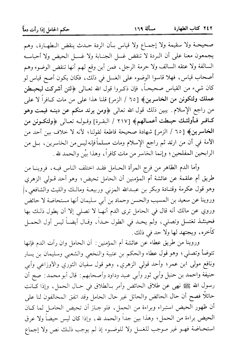 صَحِيحَةٌ وَلَا سَقِيمَةٌ وَلَا إجْمَاعٌ وَلَا قِيَاسٌ بِأَنَّ الرِّدَّةَ حَدَثٌ يَنْقُضُ الطَّهَارَةَ، وَهُمْ يُجْمِعُونَ مَعَنَا عَلَى أَنَّ الرِّدَّةَ لَا تَنْقُضُ غُسْلَ الْجَنَابَةِ وَلَا غُسْلَ الْحَيْضِ وَلَا أَحْبَاسَهُ السَّالِفَةَ وَلَا عِتْقَهُ السَّالِفَ وَلَا حُرْمَةَ الرَّجُلِ، فَمِنْ أَيْنَ وَقَعَ لَهُمْ أَنَّهَا تَنْقُضُ الْوُضُوءَ وَهُمْ أَصْحَابُ قِيَاسٍ، فَهَلَّا قَاسُوا الْوُضُوءَ عَلَى الْغُسْلِ فِي ذَلِكَ، فَكَانَ يَكُونُ أَصَحَّ قِيَاسٍ لَوْ كَانَ شَيْءٌ مِنْ الْقِيَاسِ صَحِيحًا، فَإِنْ ذَكَرُوا قَوْلَ اللَّهِ تَعَالَى {لَئِنْ أَشْرَكْتَ لَيَحْبَطَنَّ عَمَلُكَ وَلَتَكُونَنَّ مِنَ الْخَاسِرِينَ} [الزمر: 65] قُلْنَا هَذَا عَلَى مَنْ مَاتَ كَافِرًا لَا عَلَى مَنْ رَاجَعَ الْإِسْلَامَ. يُبَيِّنُ ذَلِكَ قَوْلُ اللَّهِ تَعَالَى {وَمَنْ يَرْتَدِدْ مِنْكُمْ عَنْ دِينِهِ فَيَمُتْ وَهُوَ كَافِرٌ فَأُولَئِكَ حَبِطَتْ أَعْمَالُهُمْ} [البقرة: 217] وقَوْله تَعَالَى {وَلَتَكُونَنَّ مِنَ الْخَاسِرِينَ} [الزمر: 65] شَهَادَةٌ صَحِيحَةٌ قَاطِعَةٌ لِقَوْلِنَا، لِأَنَّهُ لَا خِلَافَ بَيْنَ أَحَدٍ مِنْ الْأُمَّةِ فِي أَنَّ مَنْ ارْتَدَّ ثُمَّ رَاجَعَ الْإِسْلَامَ وَمَاتَ مُسْلِمًا فَإِنَّهُ لَيْسَ مِنْ الْخَاسِرِينَ، بَلْ مِنْ الرَّابِحِينَ الْمُفْلِحِينَ، وَإِنَّمَا الْخَاسِرُ مَنْ مَاتَ كَافِرًا، وَهَذَا بَيِّنٌ وَالْحَمْدُ لِلَّهِ.