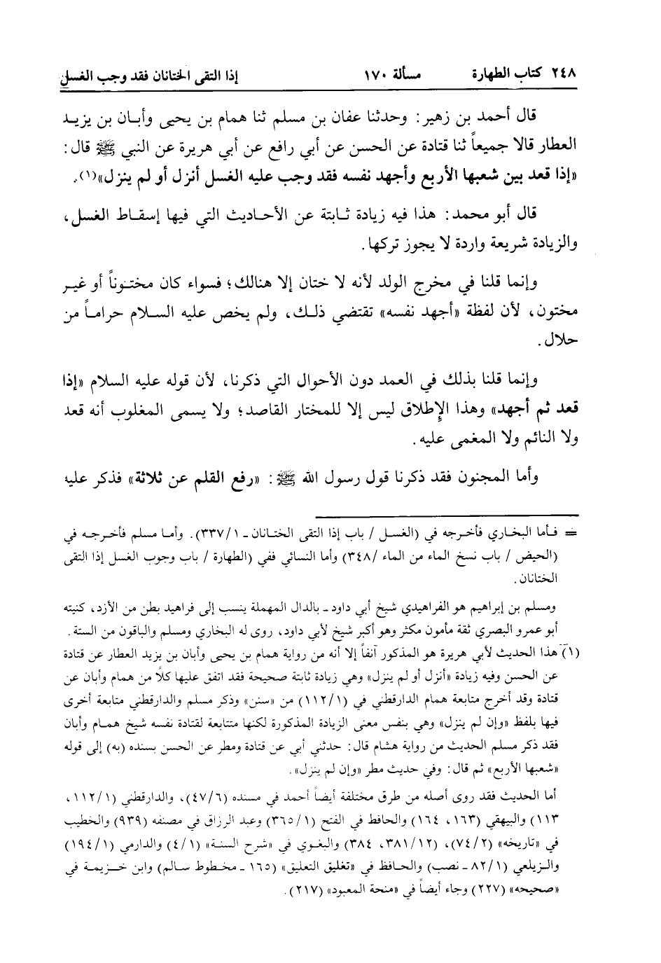قَالَ أَحْمَدُ بْنُ زُهَيْرٍ: وَحَدَّثَنَا عَفَّانُ بْنُ مُسْلِمٍ ثنا هَمَّامُ بْنُ يَحْيَى وَأَبَانُ بْنُ يَزِيدَ الْعَطَّارُ قَالَا جَمِيعًا ثنا قَتَادَةَ عَنْ الْحَسَنِ عَنْ أَبِي رَافِعٍ عَنْ أَبِي هُرَيْرَةَ عَنْ النَّبِيِّ - صَلَّى اللَّهُ عَلَيْهِ وَسَلَّمَ - قَالَ: «إذَا قَعَدَ بَيْنَ شُعَبِهَا الْأَرْبَعِ وَأَجْهَدَ نَفْسَهُ فَقَدْ وَجَبَ عَلَيْهِ الْغُسْلُ أَنْزَلَ أَوْ لَمْ يُنْزِلْ» .