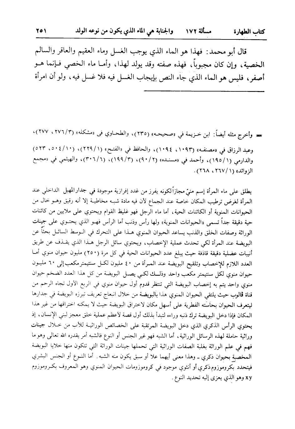 قَالَ أَبُو مُحَمَّدٍ: فَهَذَا هُوَ الْمَاءُ الَّذِي يُوجِبُ الْغُسْلَ وَمَاءُ الْعَقِيمِ وَالْعَاقِرِ وَالسَّالِمِ الْخُصْيَةِ، وَإِنْ كَانَ مَجْبُوبًا، فَهَذِهِ صِفَتُهُ وَقَدْ يُولَدُ لِهَذَا، وَأَمَّا مَاءُ الْخَصِيِّ فَإِنَّمَا هُوَ أَصْفَرُ، فَلَيْسَ هُوَ الْمَاءُ الَّذِي جَاءَ النَّصُّ بِإِيجَابِ الْغُسْلِ فِيهِ فَلَا غُسْلَ فِيهِ، وَلَوْ أَنَّ امْرَأَةً
