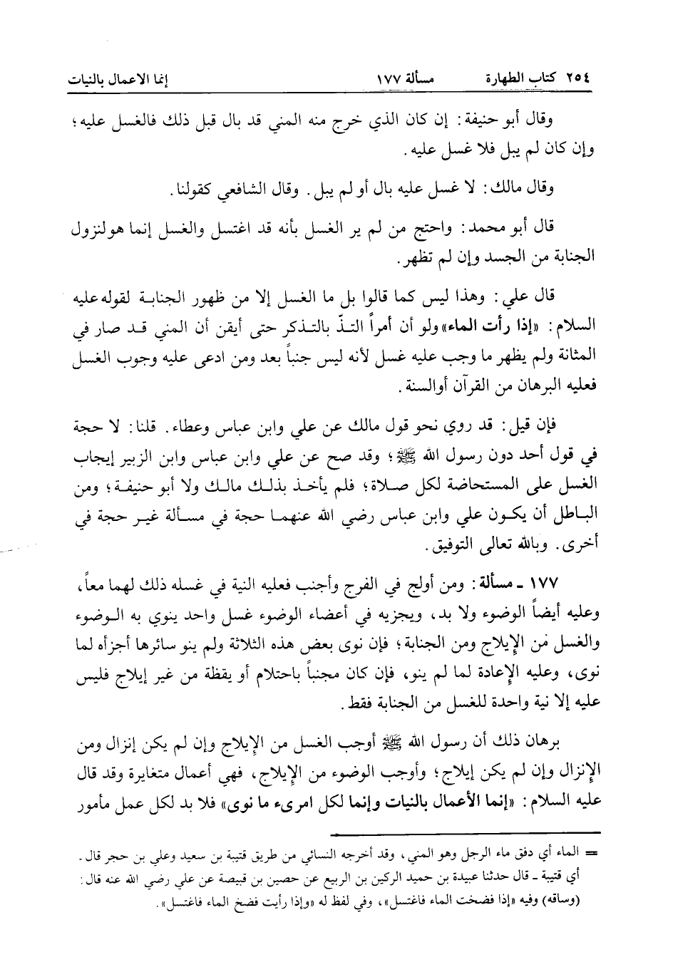 . 177 - مَسْأَلَةٌ: وَمَنْ أَوْلَجَ فِي الْفَرْجِ وَأَجْنَبَ فَعَلَيْهِ النِّيَّةُ فِي غُسْلِهِ ذَلِكَ لَهُمَا مَعًا، وَعَلَيْهِ أَيْضًا الْوُضُوءُ وَلَا بُدَّ، وَيُجْزِيهِ فِي أَعْضَاءِ الْوُضُوءِ غُسْلٌ وَاحِدٌ يَنْوِي بِهِ الْوُضُوءَ وَالْغُسْلَ مِنْ الْإِيلَاجِ وَمِنْ الْجَنَابَةِ، فَإِنْ نَوَى بَعْضَ هَذِهِ الثَّلَاثَةِ وَلَمْ يَنْوِ سَائِرَهَا أَجْزَأَهُ لِمَا نَوَى، وَعَلَيْهِ الْإِعَادَةُ لِمَا لَمْ يَنْوِ، فَإِنْ كَانَ مُجْنِبًا بِاحْتِلَامٍ أَوْ يَقِظَةٍ مِنْ غَيْرِ إيلَاجٍ فَلَيْسَ عَلَيْهِ إلَّا نِيَّةٌ وَاحِدَةٌ لِلْغُسْلِ مِنْ الْجَنَابَةِ فَقَطْ.