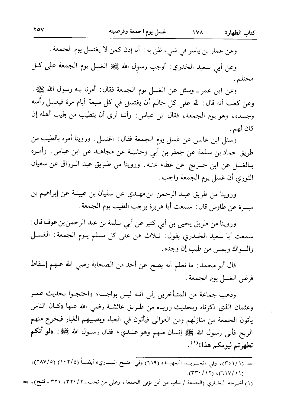 وَعَنْ عَمَّارِ بْنِ يَاسِرٍ فِي شَيْءٍ ظَنَّ بِهِ: أَنَا إذَنْ كَمَنْ لَا يَغْتَسِلُ يَوْمَ الْجُمُعَةِ. وَعَنْ أَبِي سَعِيدٍ الْخُدْرِيِّ: «أَوْجَبَ رَسُولُ اللَّهِ - صَلَّى اللَّهُ عَلَيْهِ وَسَلَّمَ - الْغُسْلَ يَوْمَ الْجُمُعَةِ عَلَى كُلِّ مُحْتَلِمٍ» . وَعَنْ ابْنِ عُمَرَ - وَسُئِلَ عَنْ الْغُسْلِ يَوْمَ الْجُمُعَةِ فَقَالَ: «أَمَرَنَا بِهِ رَسُولُ اللَّهِ - صَلَّى اللَّهُ عَلَيْهِ وَسَلَّمَ -» . وَعَنْ كَعْبٍ أَنَّهُ قَالَ: لِلَّهِ عَلَى كُلِّ حَالِمٍ أَنْ يَغْتَسِلَ فِي كُلِّ سَبْعَةِ أَيَّامٍ مَرَّةً فَيَغْسِلُ رَأْسَهُ وَجَسَدَهُ، وَهُوَ يَوْمُ الْجُمُعَةِ فَقَالَ ابْنُ عَبَّاسٍ: وَأَنَا أَرَى أَنْ يَتَطَيَّبَ مِنْ طِيبِ أَهْلِهِ إنْ كَانَ لَهُمْ. وَسُئِلَ ابْنُ عَبَّاسٍ عَنْ غُسْلِ يَوْمِ الْجُمُعَةِ فَقَالَ: اغْتَسِلْ. وَرُوِّينَا أَمْرَهُ بِالطِّيبِ مِنْ طَرِيقِ حَمَّادِ بْنِ سَلَمَةَ عَنْ جَعْفَرِ بْنِ أَبِي وَحْشِيَّةِ عَنْ مُجَاهِدٍ عَنْ ابْنِ عَبَّاسٍ. وَأَمْرَهُ بِالْغُسْلِ عَنْ ابْنِ جُرَيْجٍ عَنْ عَطَاءٍ عَنْهُ. وَرُوِّينَا مِنْ طَرِيقِ عَبْدِ الرَّزَّاقِ عَنْ سُفْيَانَ الثَّوْرِيِّ أَنَّ غُسْلَ يَوْمِ الْجُمُعَةِ وَاجِبٌ. وَرُوِّينَا مِنْ طَرِيقِ عَبْدِ الرَّحْمَنِ بْنِ مَهْدِيٍّ عَنْ سُفْيَانَ بْنِ عُيَيْنَةَ عَنْ إبْرَاهِيمَ بْنِ مَيْسَرَةَ عَنْ طَاوُسٍ قَالَ: سَمِعْت أَبَا هُرَيْرَةَ يُوجِبُ الطِّيبَ يَوْمَ الْجُمُعَةِ. وَرُوِّينَا مِنْ طَرِيقِ يَحْيَى بْنِ أَبِي كَثِيرٍ عَنْ أَبِي سَلَمَةَ بْنِ عَبْدِ الرَّحْمَنِ بْنِ عَوْفٍ قَالَ: سَمِعْت أَبَا سَعِيدٍ الْخُدْرِيَّ يَقُولُ: ثَلَاثٌ هُنَّ عَلَى كُلِّ مُسْلِمٍ يَوْمَ الْجُمُعَةِ: الْغُسْلُ وَالسِّوَاكُ وَيَمَسُّ مِنْ طِيبٍ إنْ وَجَدَهُ.