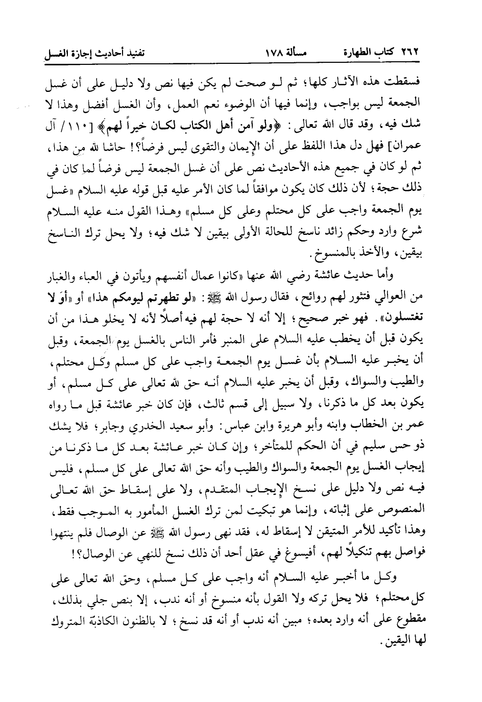 فَسَقَطَتْ هَذِهِ الْآثَارُ كُلُّهَا، ثُمَّ لَوْ صَحَّتْ لَمْ يَكُنْ فِيهَا نَصٌّ وَلَا دَلِيلٌ عَلَى أَنَّ غُسْلَ الْجُمُعَةِ لَيْسَ بِوَاجِبٍ، وَإِنَّمَا فِيهَا أَنَّ الْوُضُوءَ نِعْمَ الْعَمَلُ، وَأَنَّ الْغُسْلَ أَفْضَلُ وَهَذَا لَا شَكَّ فِيهِ، وَقَدْ قَالَ اللَّهُ تَعَالَى: {وَلَوْ آمَنَ أَهْلُ الْكِتَابِ لَكَانَ خَيْرًا لَهُمْ} [آل عمران: 110] فَهَلْ دَلَّ هَذَا اللَّفْظُ عَلَى أَنَّ الْإِيمَانَ وَالتَّقْوَى لَيْسَ فَرْضًا؟ حَاشَا لِلَّهِ مِنْ هَذَا، ثُمَّ لَوْ كَانَ فِي جَمِيعِ هَذِهِ الْأَحَادِيثِ نَصٌّ عَلَى أَنَّ غُسْلَ الْجُمُعَةِ لَيْسَ فَرْضًا لَمَا كَانَ فِي ذَلِكَ حُجَّةٌ، لِأَنَّ ذَلِكَ كَانَ يَكُونُ مُوَافِقًا لِمَا كَانَ الْأَمْرُ عَلَيْهِ قَبْلَ قَوْلِهِ - عَلَيْهِ السَّلَامُ - «غُسْلُ يَوْمِ الْجُمُعَةِ وَاجِبٌ عَلَى كُلِّ مُحْتَلِمٍ وَعَلَى كُلِّ مُسْلِمٍ» وَهَذَا الْقَوْلُ مِنْهُ - عَلَيْهِ السَّلَامُ - شَرْعٌ وَارِدٌ وَحُكْمٌ زَائِدٌ نَاسِخٌ لِلْحَالَةِ الْأُولَى بِيَقِينٍ لَا شَكَّ فِيهِ، وَلَا يَحِلُّ تَرْكُ النَّاسِخِ بِيَقِينٍ، وَالْأَخْذُ بِالْمَنْسُوخِ.