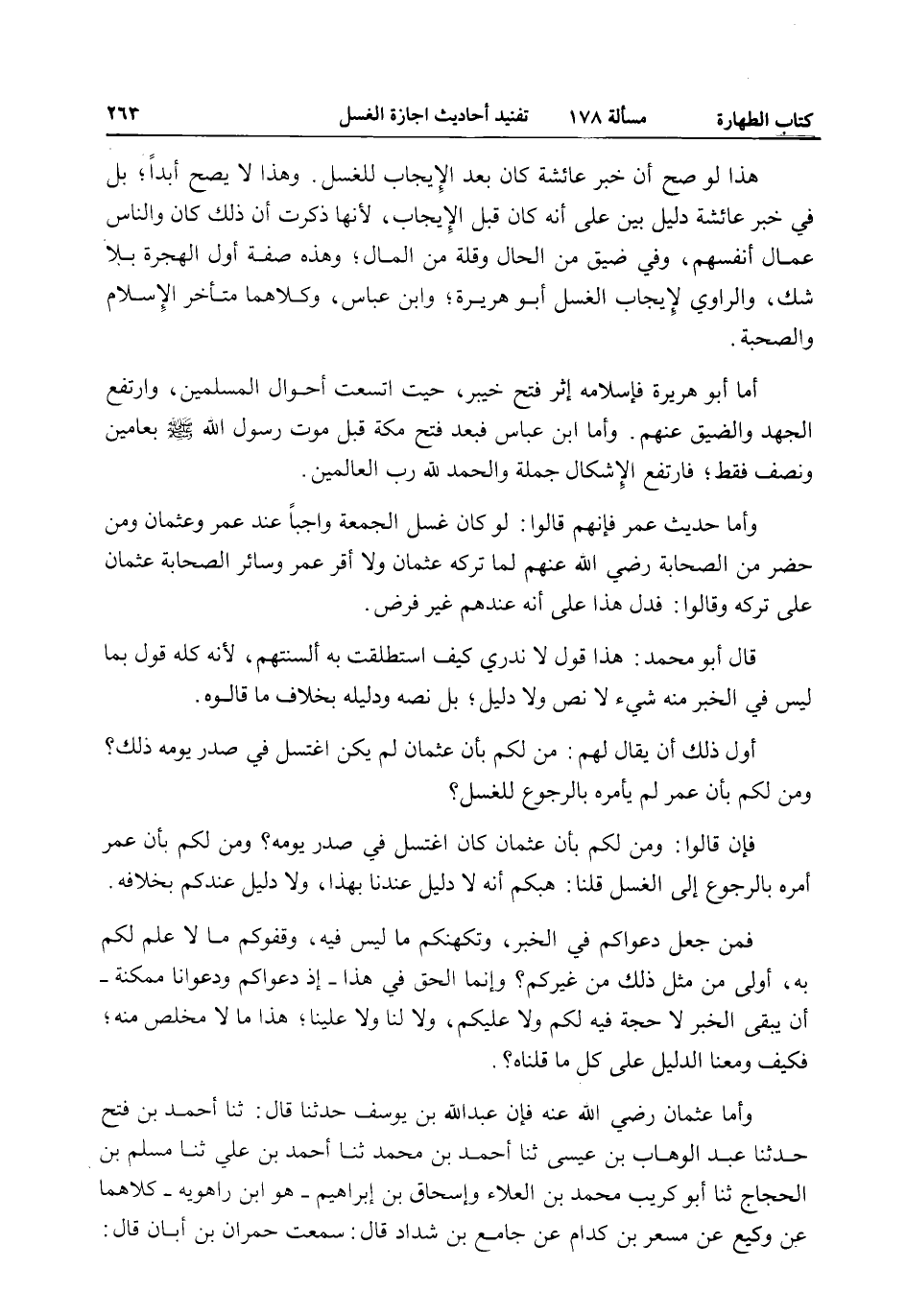 قَالَ أَبُو مُحَمَّدٍ: هَذَا قَوْلٌ لَا نَدْرِي كَيْفَ اُسْتُطْلِقَتْ بِهِ أَلْسِنَتُهُمْ لِأَنَّهُ كُلَّهُ قَوْلٌ بِمَا لَيْسَ فِي الْخَبَرِ مِنْهُ شَيْءٌ لَا نَصٌّ وَلَا دَلِيلٌ، بَلْ نَصُّهُ وَدَلِيلُهُ بِخِلَافِ مَا قَالُوهُ. أَوَّلُ ذَلِكَ أَنْ يُقَالَ لَهُمْ: مَنْ لَكُمْ بِأَنَّ عُثْمَانَ لَمْ يَكُنْ اغْتَسَلَ فِي صَدْرِ يَوْمِهِ ذَلِكَ؟ وَمَنْ لَكُمْ بِأَنَّ عُمَرَ لَمْ يَأْمُرْهُ بِالرُّجُوعِ لِلْغُسْلِ؟ فَإِنْ قَالُوا: وَمَنْ لَكُمْ بِأَنَّ عُثْمَانَ كَانَ اغْتَسَلَ فِي صَدْرِ يَوْمِهِ؟ وَمَنْ لَكُمْ بِأَنَّ عُمَرَ أَمَرَهُ بِالرُّجُوعِ إلَى الْغُسْلِ قُلْنَا: هَبْكُمْ أَنَّهُ لَا دَلِيلَ عِنْدَنَا بِهَذَا، وَلَا دَلِيلَ عِنْدَكُمْ بِخِلَافِهِ. فَمَنْ جَعَلَ دَعْوَاكُمْ فِي الْخَبَرِ، وَتَكَهُّنَكُمْ مَا لَيْسَ فِيهِ، وَقَفْوُكُمْ مَا لَا عِلْمَ لَكُمْ بِهِ، أَوْلَى مِنْ مِثْلِ ذَلِكَ مِنْ غَيْرِكُمْ؟ وَإِنَّمَا الْحَقُّ فِي هَذَا - إذْ دَعَوَاكُمْ وَدَعَوَانَا مُمْكِنَةٌ - أَنْ يَبْقَى الْخَبَرُ لَا حُجَّةَ فِيهِ لَكُمْ وَلَا عَلَيْكُمْ، وَلَا لَنَا وَلَا عَلَيْنَا، هَذَا مَا لَا مَخْلَصَ مِنْهُ، فَكَيْفَ وَمَعَنَا الدَّلِيلُ عَلَى مَا قُلْنَاهُ؟ .