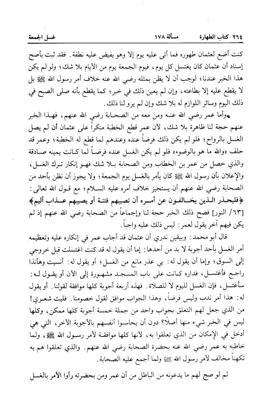 قَالَ أَبُو مُحَمَّدٍ: وَبِيَقِينٍ نَدْرِي أَنَّ عُثْمَانَ قَدْ أَجَابَ عُمَرَ فِي إنْكَارِهِ عَلَيْهِ وَتَعْظِيمِهِ أَمْرَ الْغُسْلِ بِأَحَدِ أَجْوِبَةٍ لَا بُدَّ مِنْ أَحَدِهَا: إمَّا أَنْ يَقُولَ لَهُ قَدْ كُنْت اغْتَسَلْت قَبْلَ خُرُوجِي إلَى السُّوقِ، وَإِمَّا أَنْ يَقُولَ لَهُ: بِي عُذْرٌ مَانِعٌ مِنْ الْغُسْلِ، أَوْ يَقُولَ لَهُ: أُنْسِيتُ وَهَا أَنَا ذَا رَاجِعٌ فَأَغْتَسِلُ، فَدَارُهُ كَانَتْ عَلَى بَابِ الْمَسْجِدِ مَشْهُورَةٌ إلَى الْآنِ أَوْ يَقُولُ لَهُ: سَأَغْتَسِلُ، فَإِنَّ الْغُسْلَ لِلْيَوْمِ لَا لِلصَّلَاةِ. فَهَذِهِ أَرْبَعَةُ أَجْوِبَةٍ كُلُّهَا مُوَافِقَةٌ لِقَوْلِنَا. أَوْ يَقُولُ لَهُ: هَذَا أَمْرُ نَدْبٍ وَلَيْسَ فَرْضًا، وَهَذَا الْجَوَابُ مُوَافِقٌ لِقَوْلِ خُصُومِنَا. فَلَيْتَ شِعْرِي مَنْ الَّذِي جَعَلَ لَهُمْ التَّعَلُّقَ بِجَوَابٍ وَاحِدٍ مِنْ جُمْلَةِ خَمْسَةِ أَجْوِبَةٍ كُلُّهَا مُمْكِنٌ، وَكُلُّهَا لَيْسَ فِي الْخَبَرِ شَيْءٌ مِنْهَا أَصْلًا؟ دُونَ أَنْ يُحَاسِبُوا أَنْفُسَهُمْ بِالْأَجْوِبَةِ الْأُخَرِ الَّتِي هِيَ أَدْخَلُ فِي الْإِمْكَانِ مِنْ الَّذِي تَعَلَّقُوا بِهِ، لِأَنَّهَا كُلُّهَا مُوَافِقَةٌ لِأَمْرِ رَسُولِ اللَّهِ - صَلَّى اللَّهُ عَلَيْهِ وَسَلَّمَ - وَلِمَا خَاطَبَهُ بِهِ عُمَرُ - رَضِيَ اللَّهُ عَنْهُ - بِحَضْرَةِ الصَّحَابَةِ - رَضِيَ اللَّهُ عَنْهُمْ -. وَاَلَّذِي تَعَلَّقُوا هُمْ بِهِ تَكَهُّنٌ مُخَالِفٌ لِأَمْرِ رَسُولِ اللَّهِ - صَلَّى اللَّهُ عَلَيْهِ وَسَلَّمَ - وَلِمَا أَجْمَعَ عَلَيْهِ الصَّحَابَةُ. ثُمَّ لَوْ صَحَّ لَهُمْ مَا يَدَّعُونَهُ مِنْ الْبَاطِلِ مِنْ أَنَّ عُمَرَ وَمَنْ بِحَضْرَتِهِ رَأَوْا الْأَمْرَ بِالْغُسْلِ