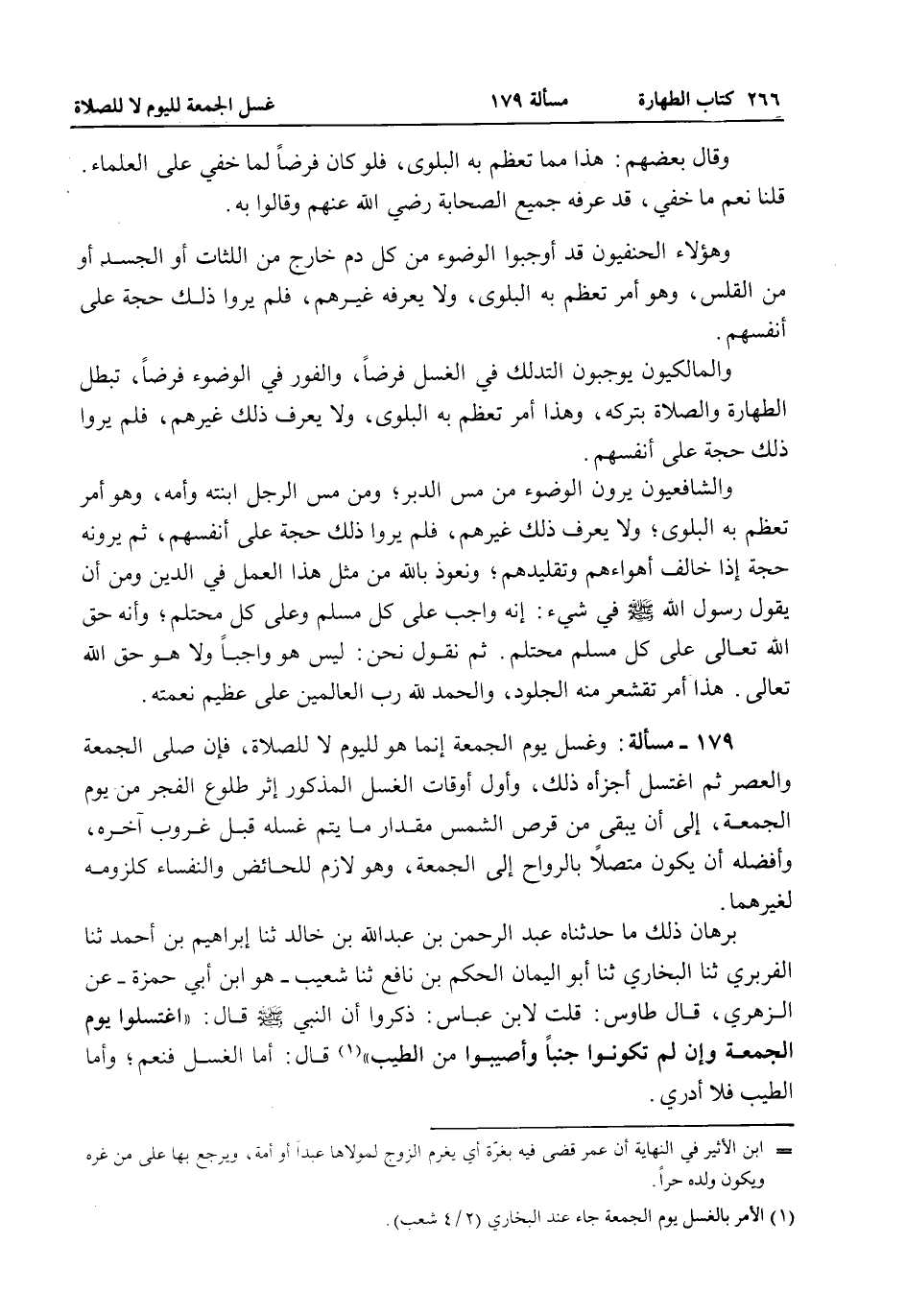 بُرْهَانُ ذَلِكَ مَا حَدَّثَنَاهُ عَبْدُ الرَّحْمَنِ بْنُ عَبْدِ اللَّهِ بْنِ خَالِدٍ ثنا إبْرَاهِيمُ بْنُ أَحْمَدَ ثنا الْفَرَبْرِيُّ ثنا الْبُخَارِيُّ ثنا أَبُو الْيَمَانِ الْحَكَمُ بْنِ نَافِعٍ ثنا شُعَيْبٌ هُوَ ابْنُ أَبِي حَمْزَةَ - عَنْ الزُّهْرِيِّ، قَالَ طَاوُسٌ: قُلْت لِابْنِ عَبَّاسٍ: ذَكَرُوا أَنَّ النَّبِيَّ - صَلَّى اللَّهُ عَلَيْهِ وَسَلَّمَ - قَالَ: «اغْتَسِلُوا يَوْمَ الْجُمُعَةِ وَإِنْ لَمْ تَكُونُوا جُنُبًا وَأَصِيبُوا مِنْ الطِّيبِ» قَالَ: أَمَّا الْغُسْلُ فَنَعَمْ، وَأَمَّا الطِّيبُ فَلَا أَدْرِي.