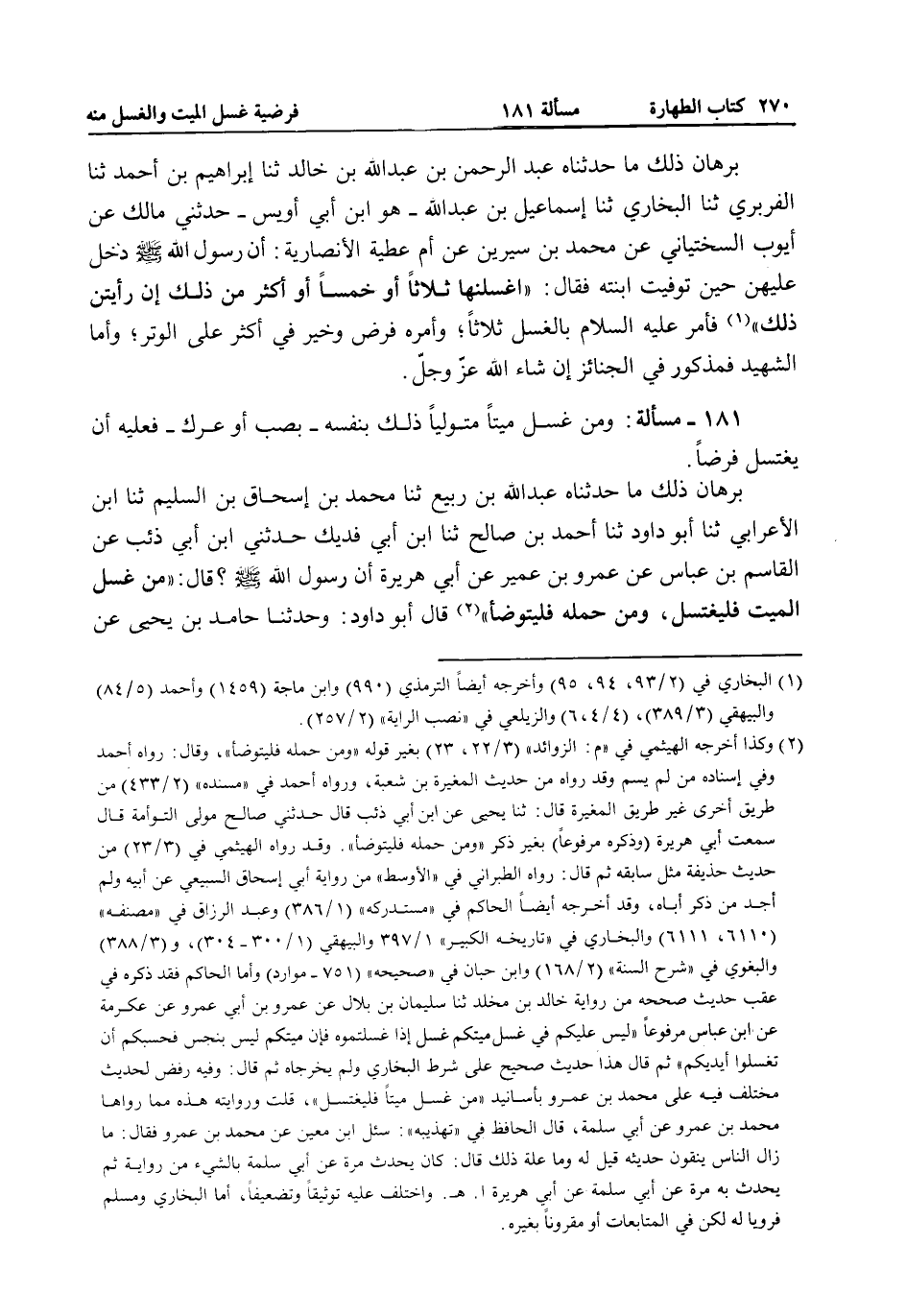 بُرْهَانُ ذَلِكَ مَا حَدَّثَنَاهُ عَبْدُ الرَّحْمَنِ بْنُ عَبْدِ اللَّهِ بْنِ خَالِدٍ ثنا إبْرَاهِيمُ بْنُ أَحْمَدَ ثنا الْفَرَبْرِيُّ ثنا الْبُخَارِيُّ ثنا إسْمَاعِيلُ بْنُ عَبْدِ اللَّهِ هُوَ ابْنُ أَبِي أُوَيْسٍ - حَدَّثَنِي مَالِكٌ عَنْ أَيُّوبَ السِّخْتِيَانِيِّ عَنْ مُحَمَّدِ بْنِ سِيرِينَ عَنْ أُمِّ عَطِيَّةَ الْأَنْصَارِيَّةِ: «أَنَّ رَسُولَ اللَّهِ - صَلَّى اللَّهُ عَلَيْهِ وَسَلَّمَ - دَخَلَ عَلَيْهِنَّ حِينَ تُوُفِّيَتْ ابْنَتُهُ فَقَالَ: اغْسِلْنَهَا ثَلَاثًا أَوْ خَمْسًا أَوْ أَكْثَرَ مِنْ ذَلِكَ إنْ رَأَيْتُنَّ ذَلِكَ» فَأَمَرَ - عَلَيْهِ السَّلَامُ - بِالْغُسْلِ ثَلَاثًا، وَأَمْرُهُ فَرْضٌ وَخَيْرٌ فِي أَكْثَرَ عَلَى الْوِتْرِ، وَأَمَّا الشَّهِيدُ فَمَذْكُورٌ فِي الْجَنَائِزِ إنْ شَاءَ اللَّهُ عَزَّ وَجَلَّ.