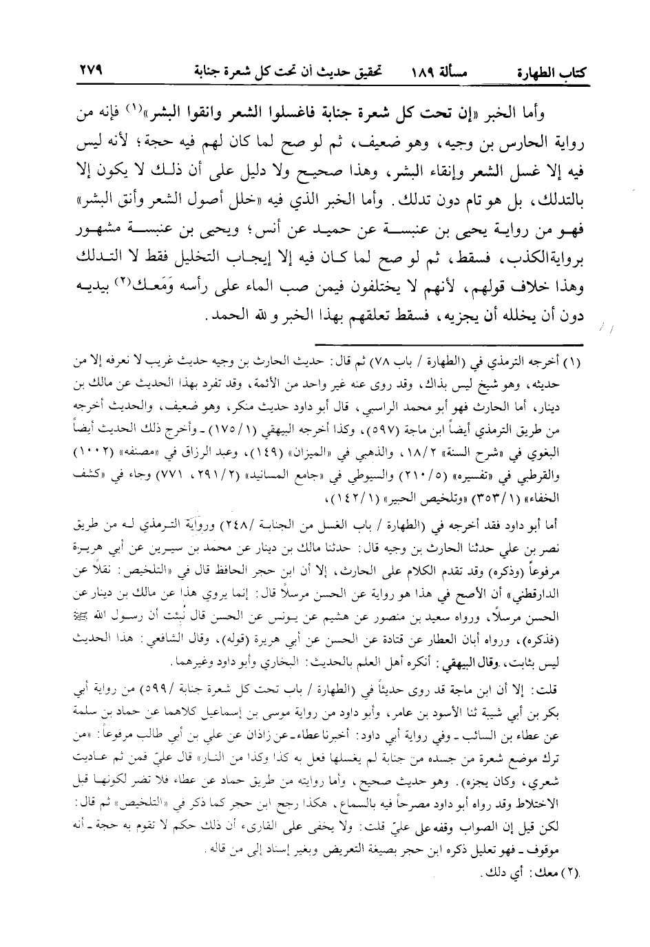 وَأَمَّا الْخَبَرُ «إنَّ تَحْتَ كُلِّ شَعْرَةٍ جَنَابَةً فَاغْسِلُوا الشَّعْرَ وَأَنْقُوا الْبَشَرَ» فَإِنَّهُ مِنْ رِوَايَةِ الْحَارِسِ بْنِ وَجِيهٍ، وَهُوَ ضَعِيفٌ، ثُمَّ لَوْ صَحَّ لَمَا كَانَ لَهُمْ فِيهِ حُجَّةٌ، لِأَنَّهُ لَيْسَ فِيهِ إلَّا غَسْلُ الشَّعْرِ وَإِنْقَاءُ الْبَشَرِ، وَهَذَا صَحِيحٌ وَلَا دَلِيلَ عَلَى أَنَّ ذَلِكَ لَا يَكُونُ إلَّا بِالتَّدَلُّكِ، بَلْ هُوَ تَامٌّ دُونَ تَدَلُّكٍ.