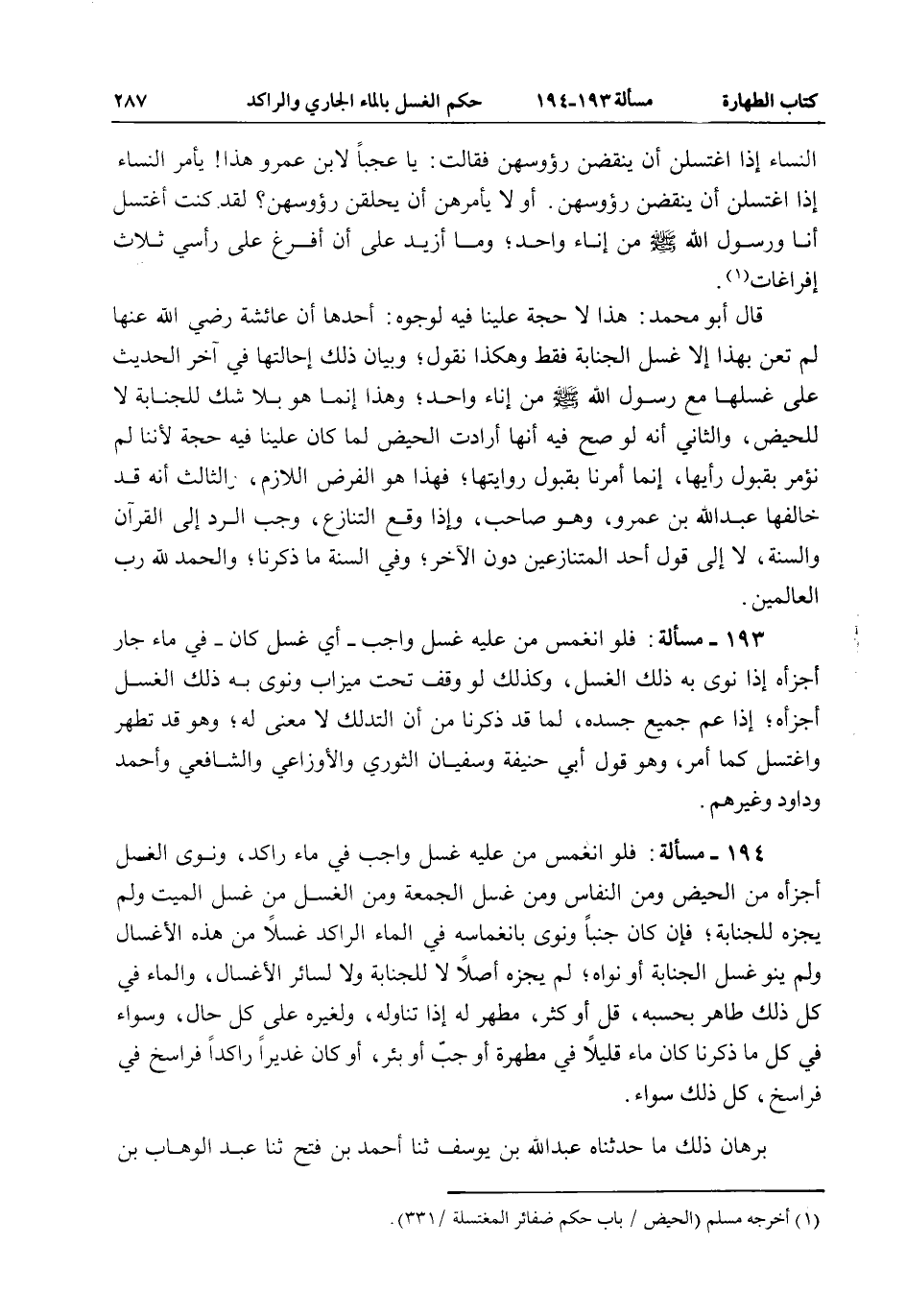 194 - مَسْأَلَةٌ: فَلَوْ انْغَمَسَ مَنْ عَلَيْهِ غُسْلٌ وَاجِبٌ فِي مَاءٍ رَاكِدٍ، وَنَوَى الْغُسْلَ أَجْزَأَهُ مِنْ الْحَيْضِ وَمِنْ النِّفَاسِ وَمِنْ غُسْلِ الْجُمُعَةِ وَمِنْ الْغُسْلِ مِنْ غُسْلِ الْمَيِّتِ وَلَمْ يُجْزِهِ لِلْجَنَابَةِ، فَإِنْ كَانَ جُنُبًا وَنَوَى بِانْغِمَاسِهِ فِي الْمَاءِ الرَّاكِدِ غُسْلًا مِنْ هَذِهِ الْأَغْسَالِ وَلَمْ يَنْوِ غُسْلَ الْجَنَابَةِ أَوْ نَوَاهُ، لَمْ يُجْزِهِ أَصْلًا لَا لِلْجَنَابَةِ وَلَا لِسَائِرِ الْأَغْسَالِ، وَالْمَاءُ فِي كُلِّ ذَلِكَ طَاهِرٌ بِحَسَبِهِ، قَلَّ أَوْ كَثُرَ، مُطَهِّرٌ لَهُ إذَا تَنَاوَلَهُ، وَلِغَيْرِهِ عَلَى كُلِّ حَالٍ، وَسَوَاءٌ فِي كُلِّ مَا ذَكَرْنَا كَانَ مَاءً قَلِيلًا فِي مَطْهَرَةٍ أَوْ جُبٍّ أَوْ بِئْرٍ، أَوْ كَانَ غَدِيرًا رَاكِدًا فَرَاسِخُ فِي فَرَاسِخَ، كُلُّ ذَلِكَ سَوَاءٌ.