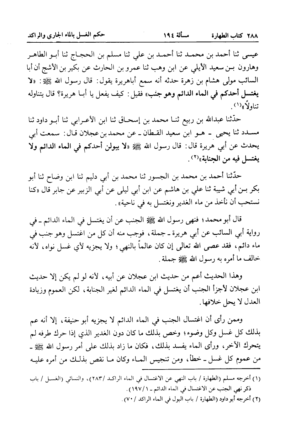 ثنا أَحْمَدُ بْنُ مُحَمَّدٍ ثنا أَحْمَدُ بْنُ عَلِيٍّ ثنا مُسْلِمُ بْنُ الْحَجَّاجِ ثنا أَبُو الطَّاهِرِ وَهَارُونُ بْنُ سَعِيدِ الْأَيْلِيُّ عَنْ ابْنِ وَهْبٍ ثنا عَمْرُو بْنُ الْحَارِثِ عَنْ بُكَيْرِ بْنِ الْأَشَجِّ أَنَّ أَبَا السَّائِبِ مَوْلَى هِشَامِ بْنِ زُهْرَةَ حَدَّثَهُ أَنَّهُ سَمِعَ أَبَا هُرَيْرَةَ يَقُولُ: قَالَ رَسُولُ اللَّهِ - صَلَّى اللَّهُ عَلَيْهِ وَسَلَّمَ -: «لَا يَغْتَسِلُ أَحَدُكُمْ فِي الْمَاءِ الدَّائِمِ وَهُوَ جُنُبٌ» فَقِيلَ: كَيْفَ يَفْعَلُ يَا أَبَا هُرَيْرَةَ؟ قَالَ يَتَنَاوَلُهُ تَنَاوُلًا ".