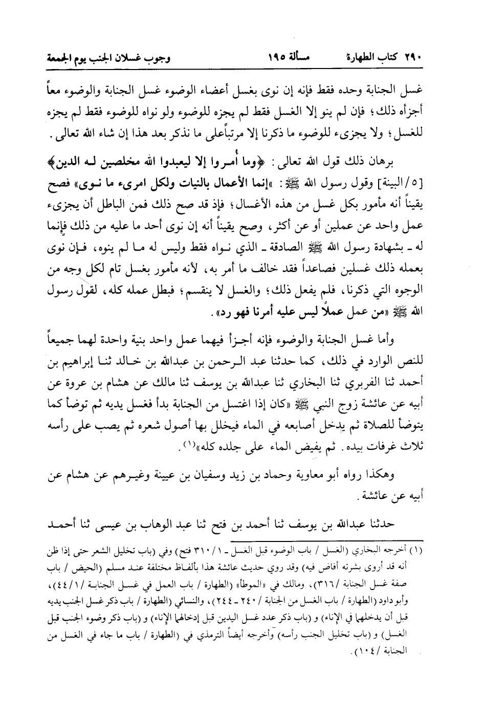 بُرْهَانُ ذَلِكَ قَوْلُ اللَّهِ تَعَالَى: {وَمَا أُمِرُوا إِلا لِيَعْبُدُوا اللَّهَ مُخْلِصِينَ لَهُ الدِّينَ} [البينة: 5] وَقَوْلُ رَسُولِ اللَّهِ - صَلَّى اللَّهُ عَلَيْهِ وَسَلَّمَ -: «إنَّمَا الْأَعْمَالُ بِالنِّيَّاتِ وَلِكُلِّ امْرِئٍ مَا نَوَى» فَصَحَّ يَقِينًا أَنَّهُ مَأْمُورٌ بِكُلٍّ غُسْلٍ مِنْ هَذِهِ الْأَغْسَالِ، فَإِذْ قَدْ صَحَّ ذَلِكَ فَمِنْ الْبَاطِلِ أَنْ يُجْزِئَ عَمَلُ وَاحِدٍ عَنْ عَمَلَيْنِ أَوْ عَنْ أَكْثَرَ، وَصَحَّ يَقِينًا أَنَّهُ إنْ نَوَى أَحَدَ مَا عَلَيْهِ مِنْ ذَلِكَ فَإِنَّمَا لَهُ - بِشَهَادَةِ رَسُولِ اللَّهِ - صَلَّى اللَّهُ عَلَيْهِ وَسَلَّمَ - الصَّادِقَةِ - الَّذِي نَوَاهُ فَقَطْ وَلَيْسَ لَهُ مَا لَمْ يَنْوِهِ، فَإِنْ نَوَى بِعَمَلِهِ ذَلِكَ غُسْلَيْنِ فَصَاعِدًا فَقَدْ خَالَفَ مَا أُمِرَ بِهِ، لِأَنَّهُ مَأْمُورٌ بِغُسْلٍ تَامٍّ لِكُلِّ وَجْهٍ مِنْ الْوُجُوهِ الَّتِي ذَكَرْنَا، فَلَمْ يَفْعَلْ ذَلِكَ، وَالْغُسْلُ لَا يَنْقَسِمُ، فَبَطَلَ عَمَلُهُ كُلُّهُ، لِقَوْلِ رَسُولِ اللَّهِ - صَلَّى اللَّهُ عَلَيْهِ وَسَلَّمَ - «مَنْ عَمِلَ عَمَلًا لَيْسَ عَلَيْهِ أَمْرُنَا فَهُوَ رَدٌّ» وَأَمَّا غُسْلُ الْجَنَابَةِ وَالْوُضُوءِ فَإِنَّهُ أَجْزَأَ فِيهِمَا عَمَلٌ وَاحِدٌ بِنِيَّةٍ وَاحِدَةٍ لَهُمَا جَمِيعًا لِلنَّصِّ الْوَارِدِ فِي ذَلِكَ، كَمَا حَدَّثَنَا عَبْدُ الرَّحْمَنِ بْنُ عَبْدِ اللَّهِ بْنِ خَالِدٍ ثنا إبْرَاهِيمُ بْنُ أَحْمَدَ ثنا الْفَرَبْرِيُّ ثنا الْبُخَارِيُّ ثنا عَبْدُ اللَّهِ بْنُ يُوسُفَ ثنا مَالِكٌ عَنْ هِشَامِ بْنِ عُرْوَةَ عَنْ أَبِيهِ عَنْ عَائِشَةَ زَوْجِ النَّبِيِّ - صَلَّى اللَّهُ عَلَيْهِ وَسَلَّمَ - «كَانَ إذَا اغْتَسَلَ مِنْ الْجَنَابَةِ بَدَأَ فَغَسَلَ يَدَيْهِ ثُمَّ تَوَضَّأَ كَمَا يَتَوَضَّأُ لِلصَّلَاةِ ثُمَّ يُدْخِلُ أَصَابِعَهُ فِي الْمَاءِ فَيُخَلِّلُ بِهَا أُصُولَ شَعْرِهِ ثُمَّ يَصُبُّ عَلَى رَأْسِهِ ثَلَاثَ غَرَفَاتٍ بِيَدِهِ، ثُمَّ يُفِيضُ الْمَاءَ عَلَى جِلْدِهِ كُلِّهِ» .