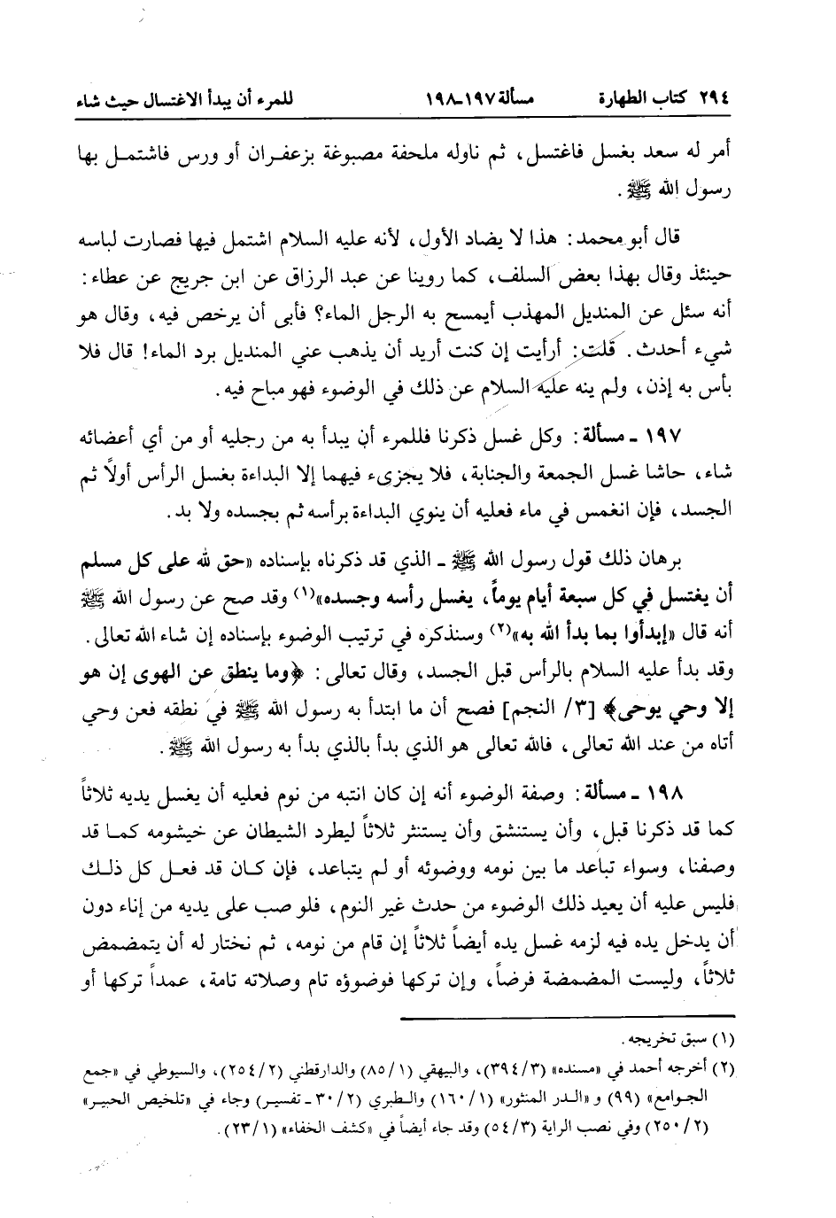 197 - مَسْأَلَةٌ: وَكُلُّ غُسْلٍ ذَكَرْنَا فَلِلْمَرْءِ أَنْ يَبْدَأَ بِهِ مِنْ رِجْلَيْهِ أَوْ مِنْ أَيِّ أَعْضَائِهِ شَاءَ، حَاشَا غُسْلَ الْجُمُعَةِ وَالْجَنَابَةِ، فَلَا يُجْزِئُ فِيهِمَا إلَّا الْبُدَاءَةُ بِغَسْلِ الرَّأْسِ أَوَّلًا ثُمَّ الْجَسَدِ، فَإِنْ انْغَمَسَ فِي مَاءٍ فَعَلَيْهِ أَنْ يَنْوِيَ الْبُدَاءَةَ بِرَأْسِهِ ثُمَّ بِجَسَدِهِ وَلَا بُدَّ.