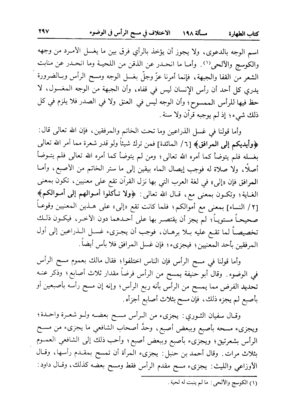 وَأَمَّا قَوْلُنَا فِي مَسْحِ الرَّأْسِ فَإِنَّ النَّاسَ اخْتَلَفُوا، فَقَالَ مَالِكٌ بِعُمُومِ مَسْحِ الرَّأْسِ فِي الْوُضُوءِ. وَقَالَ أَبُو حَنِيفَةَ يَمْسَحُ مِنْ الرَّأْسِ فَرْضًا مِقْدَارَ ثَلَاثِ أَصَابِعَ، وَذُكِرَ عَنْهُ تَحْدِيدُ الْفَرْضِ مِمَّا يُمْسَحُ مِنْ الرَّأْسِ بِأَنَّهُ رُبْعُ الرَّأْسِ، وَإِنَّهُ إنْ مَسَحَ رَأْسَهُ بِأُصْبُعَيْنِ أَوْ بِأُصْبُعٍ لَمْ يُجْزِهِ ذَلِكَ، فَإِنْ مَسَحَ بِثَلَاثِ أَصَابِعَ أَجْزَأَهُ.