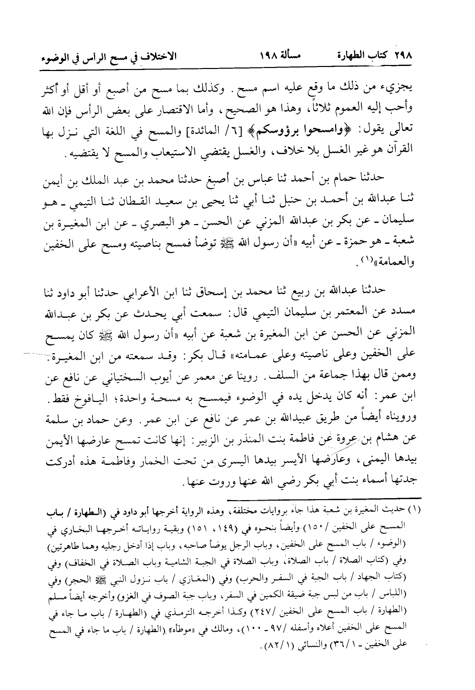 وَكَذَلِكَ بِمَا مَسَحَ مِنْ أُصْبُعٍ أَوْ أَقَلَّ أَوْ أَكْثَرَ وَأَحَبُّ إلَيْهِ الْعُمُومُ ثَلَاثًا، وَهَذَا هُوَ الصَّحِيحُ، وَأَمَّا الِاقْتِصَارُ عَلَى بَعْضِ الرَّأْسِ فَإِنَّ اللَّهَ تَعَالَى يَقُولُ: {وَامْسَحُوا بِرُءُوسِكُمْ} [المائدة: 6] وَالْمَسْحُ فِي اللُّغَةِ الَّتِي نَزَلَ بِهَا الْقُرْآنُ هُوَ غَيْرُ الْغُسْلِ بِلَا خِلَافٍ، وَالْغُسْلُ يَقْتَضِي الِاسْتِيعَابَ وَالْمَسْحُ لَا يَقْتَضِيهِ حَدَّثَنَا حُمَامُ بْنُ أَحْمَدَ ثنا عَبَّاسُ بْنُ أَصْبَغَ حَدَّثَنَا مُحَمَّدُ بْنُ عَبْدِ الْمَلِكِ بْنِ أَيْمَنَ ثنا عَبْدُ اللَّهِ بْنُ أَحْمَدَ بْنِ حَنْبَلٍ ثنا أَبِي ثنا يَحْيَى بْنُ سَعِيدِ الْقَطَّانُ ثنا التَّيْمِيُّ هُوَ سُلَيْمَانُ - عَنْ بَكْرِ بْنِ عَبْدِ اللَّهِ الْمُزَنِيِّ عَنْ الْحَسَنِ هُوَ الْبَصْرِيُّ - عَنْ ابْنِ الْمُغِيرَةِ بْنِ شُعْبَةَ هُوَ حَمْزَةُ - عَنْ أَبِيهِ «أَنَّ رَسُولَ اللَّهِ - صَلَّى اللَّهُ عَلَيْهِ وَسَلَّمَ - تَوَضَّأَ فَمَسَحَ بِنَاصِيَتِهِ وَمَسَحَ عَلَى الْخُفَّيْنِ وَالْعِمَامَةِ» حَدَّثَنَا عَبْدُ اللَّهِ بْنُ رَبِيعٍ ثنا مُحَمَّدُ بْنُ إِسْحَاقَ ثنا ابْنُ الْأَعْرَابِيِّ حَدَّثَنَا أَبُو دَاوُد ثنا مُسَدَّدٌ عَنْ الْمُعْتَمِرِ بْنِ سُلَيْمَانَ التَّيْمِيِّ قَالَ: سَمِعْتُ أَبِي يُحَدِّثُ عَنْ بَكْرِ بْنِ عَبْدِ اللَّهِ الْمُزَنِيِّ عَنْ الْحَسَنِ عَنْ ابْنِ الْمُغِيرَةِ بْنِ شُعْبَةَ عَنْ أَبِيهِ «أَنَّ رَسُولَ اللَّهِ - صَلَّى اللَّهُ عَلَيْهِ وَسَلَّمَ - كَانَ يَمْسَحُ عَلَى الْخُفَّيْنِ وَعَلَى نَاصِيَتِهِ وَعَلَى عِمَامَتِهِ» قَالَ بَكْرٌ: وَقَدْ سَمِعْتُهُ مِنْ ابْنِ الْمُغِيرَةِ.