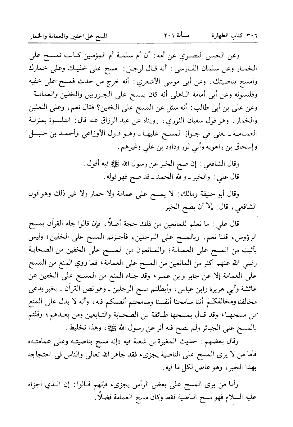 قَالَ عَلِيٌّ: مَا نَعْلَمُ لِلْمَانِعِينَ مِنْ ذَلِكَ حُجَّةً أَصْلًا، فَإِنْ قَالُوا جَاءَ الْقُرْآنُ بِمَسْحِ الرُّءُوسِ، قُلْنَا نَعَمْ، وَبِالْمَسْحِ عَلَى الرِّجْلَيْنِ، فَأَجَزْتُمْ الْمَسْحَ عَلَى الْخُفَّيْنِ، وَلَيْسَ بِأَثْبَتَ مِنْ الْمَسْحِ عَلَى الْعِمَامَةِ، وَالْمَانِعُونَ مِنْ الْمَسْحِ عَلَى الْخُفَّيْنِ مِنْ الصَّحَابَةِ - رَضِيَ اللَّهُ عَنْهُمْ - أَكْثَرُ مِنْ الْمَانِعِينَ مِنْ الْمَسْحِ عَلَى الْعِمَامَةِ، فَمَا رُوِيَ الْمَنْعُ مِنْ الْمَسْحِ عَلَى الْعِمَامَةِ إلَّا عَنْ جَابِرٍ وَابْنِ عُمَرَ، وَقَدْ جَاءَ الْمَنْعُ مِنْ الْمَسْحِ عَلَى الْخُفَّيْنِ عَنْ عَائِشَةَ وَأَبِي هُرَيْرَةَ وَابْنِ عَبَّاسٍ، وَأَبْطَلْتُمْ مَسْحَ الرِّجْلَيْنِ - وَهُوَ نَصُّ الْقُرْآنِ - بِخَبَرٍ يَدَّعِي مُخَالِفُنَا وَمُخَالِفُكُمْ أَنَّنَا سَامَحْنَا أَنْفُسَنَا وَسَامَحْتُمْ أَنْفُسَكُمْ فِيهِ، وَأَنَّهُ لَا يَدُلُّ عَلَى الْمَنْعِ مِنْ مَسْحِهَا، وَقَدْ قَالَ بِمَسْحِهَا طَائِفَةٌ مِنْ الصَّحَابَةِ وَالتَّابِعِينَ وَمَنْ بَعْدَهُمْ، وَقُلْتُمْ بِالْمَسْحِ عَلَى الْجَبَائِرِ وَلَمْ يَصِحَّ فِيهِ أَثَرٌ عَنْ رَسُولِ اللَّهِ - صَلَّى اللَّهُ عَلَيْهِ وَسَلَّمَ - وَهَذَا تَخْلِيطٌ.