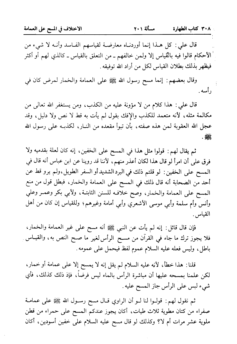 قَالَ عَلِيٌّ: كُلُّ هَذَا إنَّمَا أَوْرَدْنَاهُ مُعَارَضَةً لِقِيَاسِهِمْ الْفَاسِدِ وَأَنَّهُ لَا شَيْءَ مِنْ الْأَحْكَامِ قَالُوا فِيهِ بِالْقِيَاسِ إلَّا وَلِمَنْ خَالَفَهُمْ - مِنْ التَّعَلُّقِ بِالْقِيَاسِ - كَاَلَّذِي لَهُمْ أَوْ أَكْثَرَ فَيَظْهَرُ بِذَلِكَ بُطْلَانُ الْقِيَاسِ لِكُلِّ مَنْ أَرَادَ اللَّهُ تَوْفِيقَهُ وَقَالَ بَعْضُهُمْ: إنَّمَا مَسَحَ رَسُولُ اللَّه - صَلَّى اللَّهُ عَلَيْهِ وَسَلَّمَ - عَلَى الْعِمَامَةِ وَالْخِمَارِ لِمَرَضٍ كَانَ فِي رَأْسِهِ.