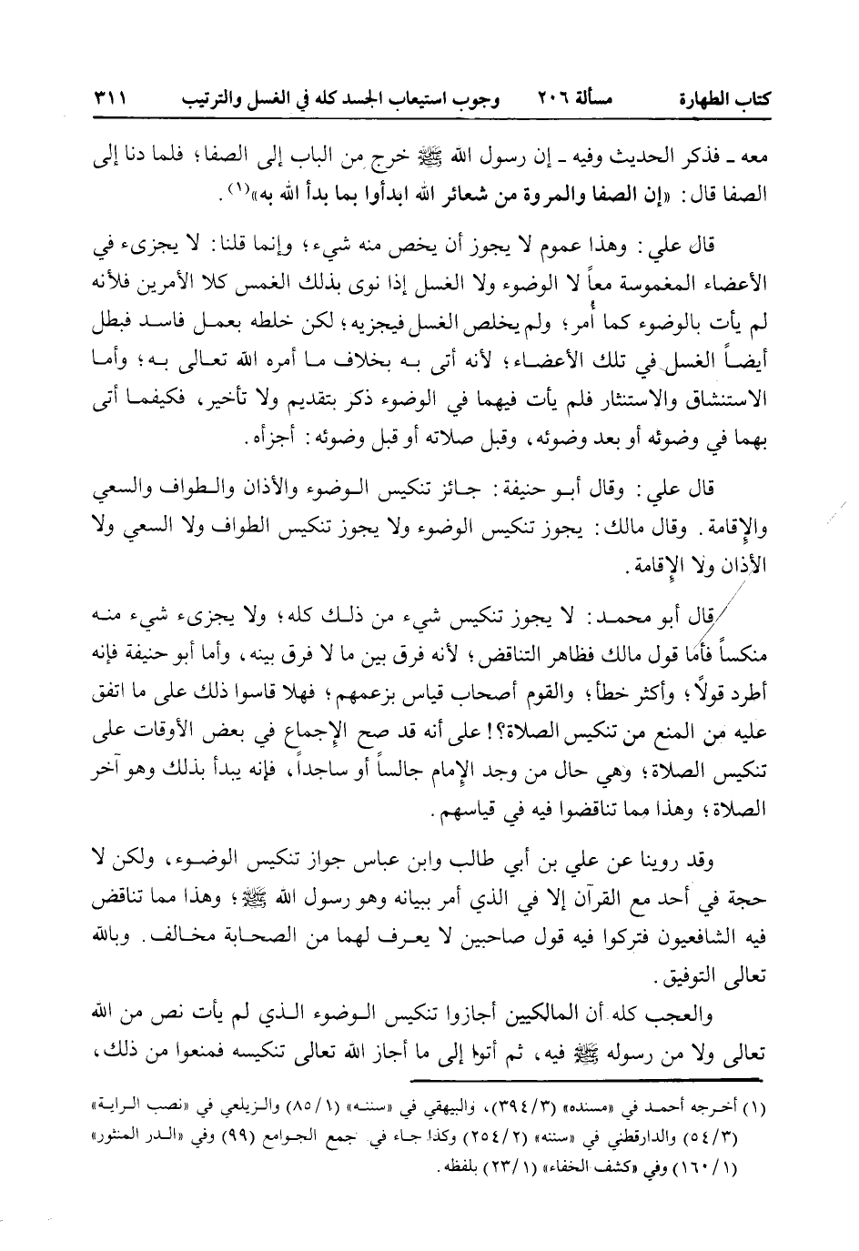 قَالَ أَبُو مُحَمَّدٍ: لَا يَجُوزُ تَنْكِيسُ شَيْءٍ مِنْ ذَلِكَ كُلِّهِ، وَلَا يُجْزِئُ شَيْءٌ مِنْهُ مُنَكَّسًا فَأَمَّا قَوْلُ مَالِكٍ فَظَاهِرُ التَّنَاقُضِ؛ لِأَنَّهُ فَرَّقَ بَيْنَ مَا لَا فَرْقَ بَيْنَهُ، وَأَمَّا أَبُو حَنِيفَةَ فَإِنَّهُ أَطَرْدُ قَوْلًا، وَأَكْثَرُ خَطَأً، وَالْقَوْمُ أَصْحَابُ قِيَاسٍ بِزَعْمِهِمْ، فَهَلَّا قَاسُوا ذَلِكَ عَلَى مَا اُتُّفِقَ عَلَيْهِ مِنْ الْمَنْعِ مِنْ تَنْكِيسِ الصَّلَاةِ؟ عَلَى أَنَّهُ قَدْ صَحَّ الْإِجْمَاعُ فِي بَعْضِ الْأَوْقَاتِ عَلَى تَنْكِيسِ الصَّلَاةِ، وَهِيَ حَالُ مَنْ وَجَدَ الْإِمَامَ جَالِسًا أَوْ سَاجِدًا، فَإِنَّهُ يَبْدَأُ بِذَلِكَ وَهُوَ آخِرُ الصَّلَاةِ، وَهَذَا مِمَّا تَنَاقَضُوا فِيهِ فِي قِيَاسِهِمْ.