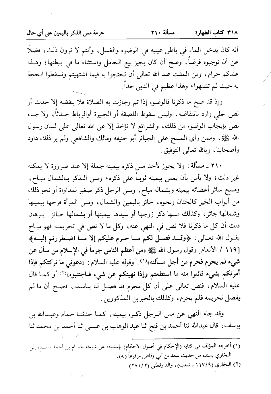 وَقَدْ جَاءَ النَّهْيُ عَنْ مَسِّ الرَّجُلِ ذَكَرَهُ بِيَمِينِهِ، كَمَا حَدَّثَنَا حَمَامٌ وَعَبْدُ اللَّهِ بْنُ يُوسُفَ، قَالَ عَبْدُ اللَّهِ ثنا أَحْمَدُ بْنُ فَتْحٍ ثنا عَبْدُ الْوَهَّابِ بْنُ عِيسَى ثنا أَحْمَدُ بْنُ مُحَمَّدٍ ثنا