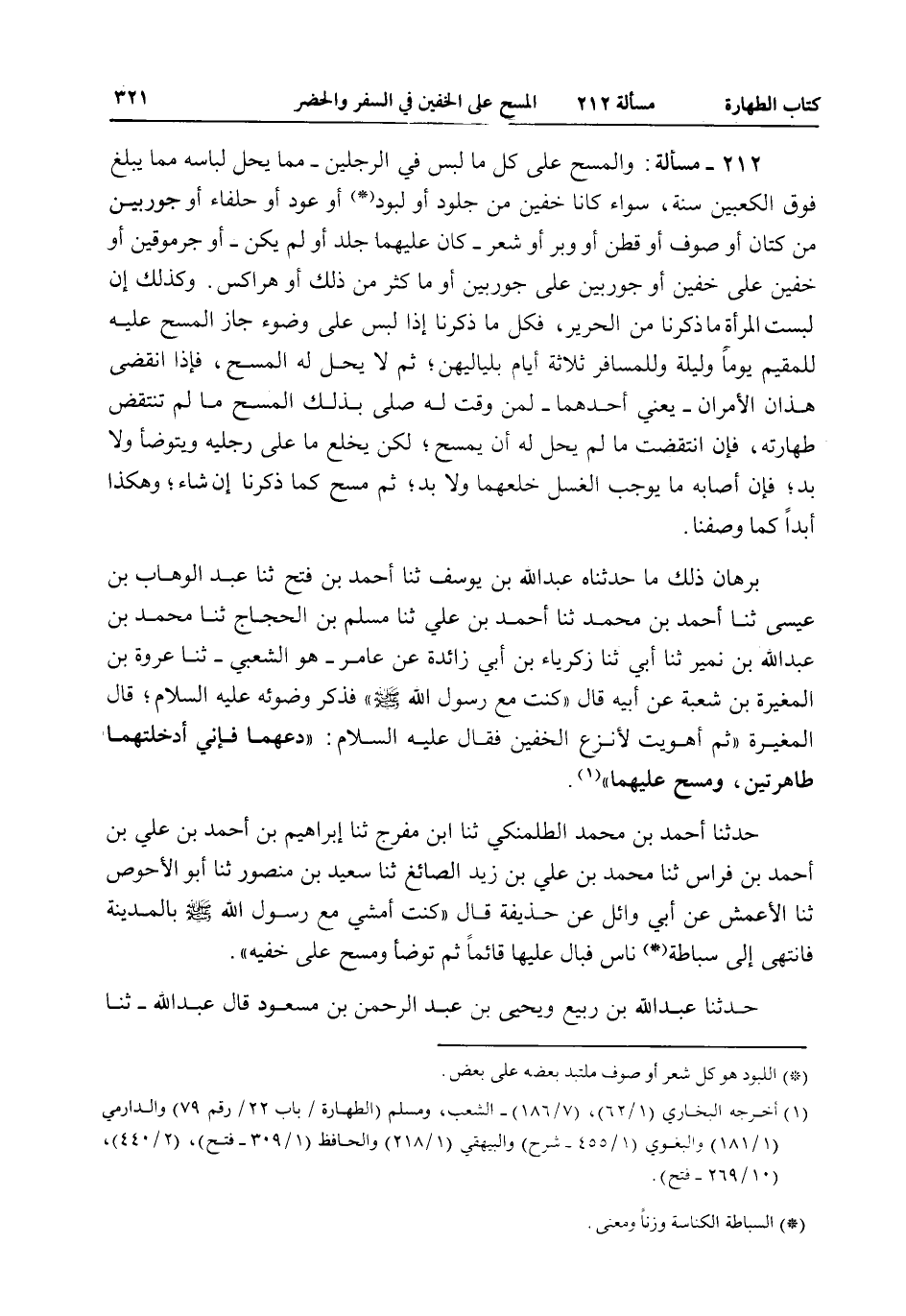 بُرْهَانُ ذَلِكَ مَا حَدَّثَنَاهُ عَبْدُ اللَّهِ بْنُ يُوسُفَ ثنا أَحْمَدُ بْنُ فَتْحٍ ثنا عَبْدُ الْوَهَّابِ بْنُ عِيسَى ثنا أَحْمَدُ بْنُ مُحَمَّدٍ ثنا أَحْمَدُ بْنُ عَلِيٍّ ثنا مُسْلِمُ بْنُ الْحَجَّاجِ ثنا مُحَمَّدُ بْنُ عَبْدِ اللَّهِ بْنِ نُمَيْرٍ ثنا أَبِي ثنا زَكَرِيَّا بْنُ أَبِي زَائِدَةَ عَنْ عَامِرٍ - هُوَ الشَّعْبِيُّ - ثنا عُرْوَةُ بْنُ الْمُغِيرَةِ بْنِ شُعْبَةَ عَنْ أَبِيهِ قَالَ «كُنْتُ مَعَ رَسُولِ اللَّهِ - صَلَّى اللَّهُ عَلَيْهِ وَسَلَّمَ - فَذَكَرَ وُضُوءَهُ - عَلَيْهِ السَّلَامُ -، قَالَ الْمُغِيرَةُ ثُمَّ أَهْوَيْتُ لِأَنْزِعَ الْخُفَّيْنِ فَقَالَ - عَلَيْهِ السَّلَامُ -: دَعْهُمَا فَإِنِّي أَدْخَلْتُهُمَا طَاهِرَتَيْنِ، وَمَسَحَ عَلَيْهِمَا» .