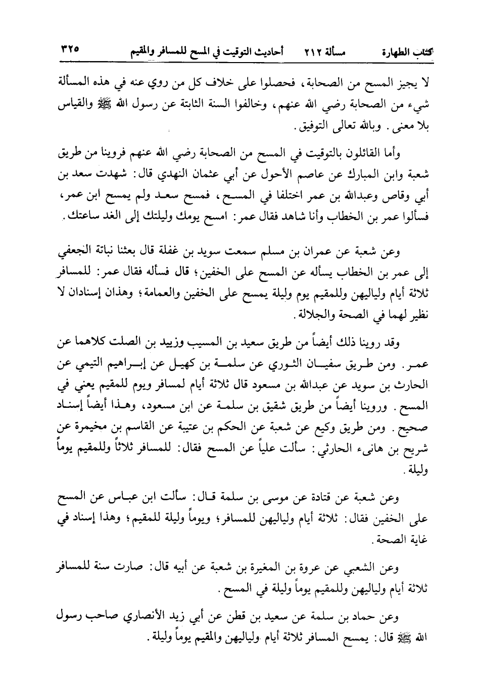 وَأَمَّا الْقَائِلُونَ بِالتَّوْقِيتِ فِي الْمَسْحِ مِنْ الصَّحَابَةِ - رَضِيَ اللَّهُ عَنْهُمْ - فَرُوِّينَا مِنْ طَرِيقِ شُعْبَةَ وَابْنِ الْمُبَارَكِ عَنْ عَاصِمٍ الْأَحْوَلِ عَنْ أَبِي عُثْمَانَ النَّهْدِيِّ قَالَ: شَهِدْتُ سَعْدَ بْنَ أَبِي وَقَّاصٍ وَعَبْدَ اللَّهِ بْنَ عُمَرَ اخْتَلَفَا فِي الْمَسْحِ، فَمَسَحَ سَعْدٌ وَلَمْ يَمْسَحْ ابْنُ عُمَرَ، فَسَأَلُوا عُمَرَ بْنَ الْخَطَّابِ وَأَنَا شَاهِدٌ فَقَالَ عُمَرُ: امْسَحْ يَوْمَكَ وَلَيْلَتَكَ إلَى الْغَدِ سَاعَتَكَ.