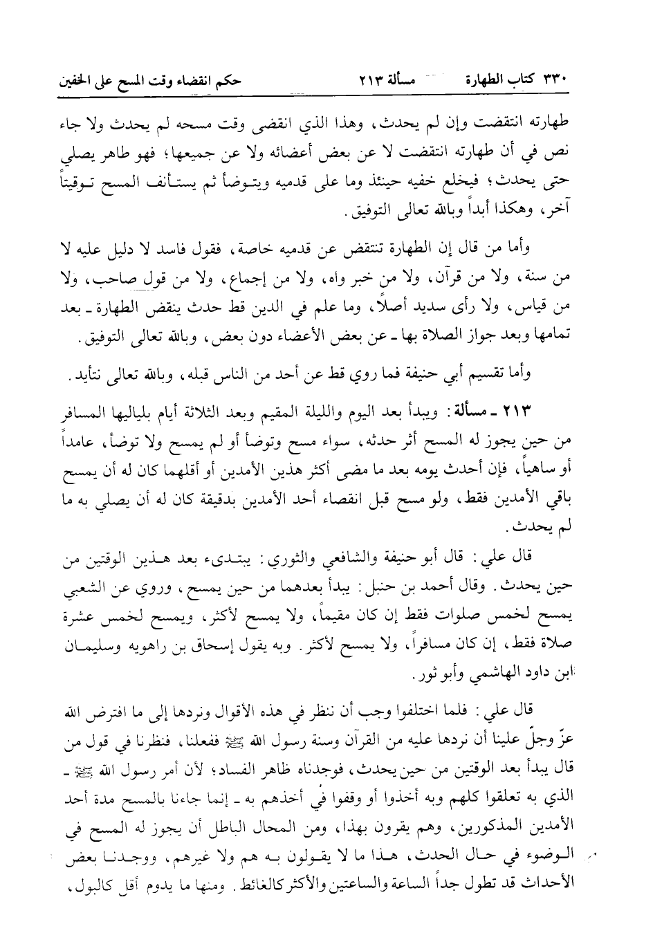 قَالَ عَلِيٌّ: فَلَمَّا اخْتَلَفُوا وَجَبَ أَنْ نَنْظُرَ فِي هَذِهِ الْأَقْوَالِ وَنَرُدَّهَا إلَى مَا افْتَرَضَ اللَّهُ عَزَّ وَجَلَّ عَلَيْنَا أَنْ نَرُدَّهَا عَلَيْهِ مِنْ الْقُرْآنِ وَسُنَّةِ رَسُولِ اللَّهِ - صَلَّى اللَّهُ عَلَيْهِ وَسَلَّمَ - فَفَعَلْنَا، فَنَظَرْنَا فِي قَوْلِ مَنْ قَالَ يَبْدَأُ بَعْدَ الْوَقْتَيْنِ مِنْ حِينِ يُحْدِثُ، فَوَجَدْنَاهُ ظَاهِرَ الْفَسَادِ؛ لِأَنَّ أَمْرَ رَسُولِ اللَّهِ - صَلَّى اللَّهُ عَلَيْهِ وَسَلَّمَ - الَّذِي بِهِ تَعَلَّقُوا كُلُّهُمْ وَبِهِ أَخَذُوا أَوْ وَقَفُوا فِي أَخْذِهِمْ بِهِ - إنَّمَا جَاءَنَا بِالْمَسْحِ مُدَّةَ أَحَدِ الْأَمَدَيْنِ الْمَذْكُورَيْنِ، وَهُمْ يُقِرُّونَ بِهَذَا، وَمِنْ الْمُحَالِ الْبَاطِلِ أَنْ يَجُوزَ لَهُ الْمَسْحُ فِي الْوُضُوءِ فِي حَالِ الْحَدَثِ، هَذَا مَا لَا يَقُولُونَ بِهِ هُمْ وَلَا غَيْرُهُمْ، وَوَجَدْنَا بَعْضَ الْأَحْدَاثِ قَدْ تَطُولُ جِدًّا السَّاعَةَ وَالسَّاعَتَيْنِ وَالْأَكْثَرُ كَالْغَائِطِ.