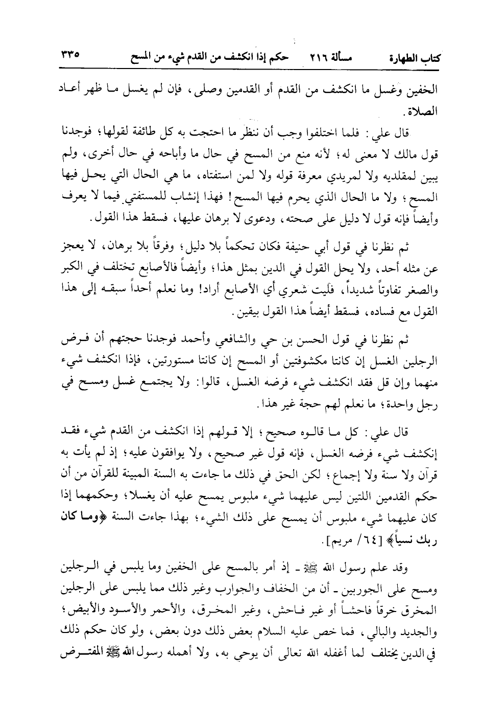 قَالَ عَلِيٌّ: كُلُّ مَا قَالُوهُ صَحِيحٌ، إلَّا قَوْلَهُمْ إذَا انْكَشَفَ مِنْ الْقَدَمِ شَيْءٌ فَقَدْ انْكَشَفَ شَيْءٌ فَرْضُهُ الْغُسْلُ، فَإِنَّهُ قَوْلٌ غَيْرُ صَحِيحٍ، وَلَا يُوَافَقُونَ عَلَيْهِ، إذْ لَمْ يَأْتِ بِهِ قُرْآنٌ وَلَا سُنَّةٌ وَلَا إجْمَاعٌ، لَكِنَّ الْحَقَّ فِي ذَلِكَ مَا جَاءَتْ بِهِ السُّنَّةُ الْمُبَيِّنَةُ لِلْقُرْآنِ مِنْ أَنَّ حُكْمَ الْقَدَمَيْنِ اللَّتَيْنِ لَيْسَ عَلَيْهِمَا شَيْءٌ مَلْبُوسٌ يُمْسَحُ عَلَيْهِ أَنْ يُغْسَلَا، وَحُكْمُهُمَا إذَا كَانَ عَلَيْهِمَا شَيْءٌ مَلْبُوسٌ أَنْ يُمْسَحَ عَلَى ذَلِكَ الشَّيْءِ، بِهَذَا جَاءَتْ السُّنَّةُ {وَمَا كَانَ رَبُّكَ نَسِيًّا} [مريم: 64] .