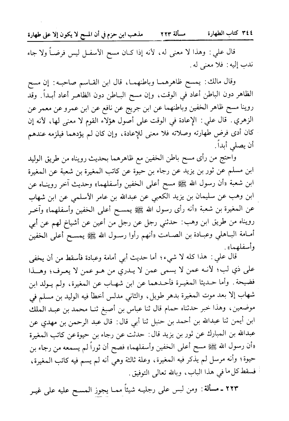 وَأَمَّا حَدِيثَا الْمُغِيرَةِ فَأَحَدُهُمَا عَنْ ابْنِ شِهَابٍ عَنْ الْمُغِيرَةِ، وَلَمْ يُولَدْ ابْنُ شِهَابٍ إلَّا بَعْدَ مَوْتِ الْمُغِيرَةِ بِدَهْرٍ طَوِيلٍ، وَالثَّانِي مُدَلِّسٌ أَخْطَأَ فِيهِ الْوَلِيدُ بْنُ مُسْلِمٍ فِي مَوْضِعَيْنِ، وَهَذَا خَبَرٌ حَدَّثَنَاهُ حَمَامٌ قَالَ ثنا عَبَّاسُ بْنُ أَصْبَغَ ثنا مُحَمَّدُ بْنُ عَبْدِ الْمَلِكِ بْنِ أَيْمَنَ ثنا عَبْدُ اللَّهِ بْنُ أَحْمَدَ بْنِ حَنْبَلٍ ثنا أَبِي قَالَ: قَالَ عَبْدُ الرَّحْمَنِ بْنُ مَهْدِيٍّ عَنْ عَبْدِ اللَّهِ بْنِ الْمُبَارَكِ عَنْ ثَوْرِ بْنِ يَزِيدَ قَالَ: حُدِّثْتُ عَنْ رَجَاءِ بْنِ حَيْوَةَ عَنْ كَاتِبِ الْمُغِيرَةِ «أَنَّ رَسُولَ اللَّهِ - صَلَّى اللَّهُ عَلَيْهِ وَسَلَّمَ - مَسَحَ أَعْلَى الْخُفَّيْنِ وَأَسْفَلَهُمَا» فَصَحَّ أَنَّ ثَوْرًا لَمْ يَسْمَعْهُ مِنْ رَجَاءِ بْنِ حَيْوَةَ، وَأَنَّهُ مُرْسَلٌ لَمْ يُذْكَرْ فِيهِ الْمُغِيرَةُ، وَعِلَّةٌ ثَالِثَةٌ وَهِيَ أَنَّهُ لَمْ يُسَمِّ فِيهِ كَاتِبَ الْمُغِيرَةِ، فَسَقَطَ كُلُّ مَا فِي هَذَا الْبَابِ، وَبِاَللَّهِ تَعَالَى التَّوْفِيقُ.