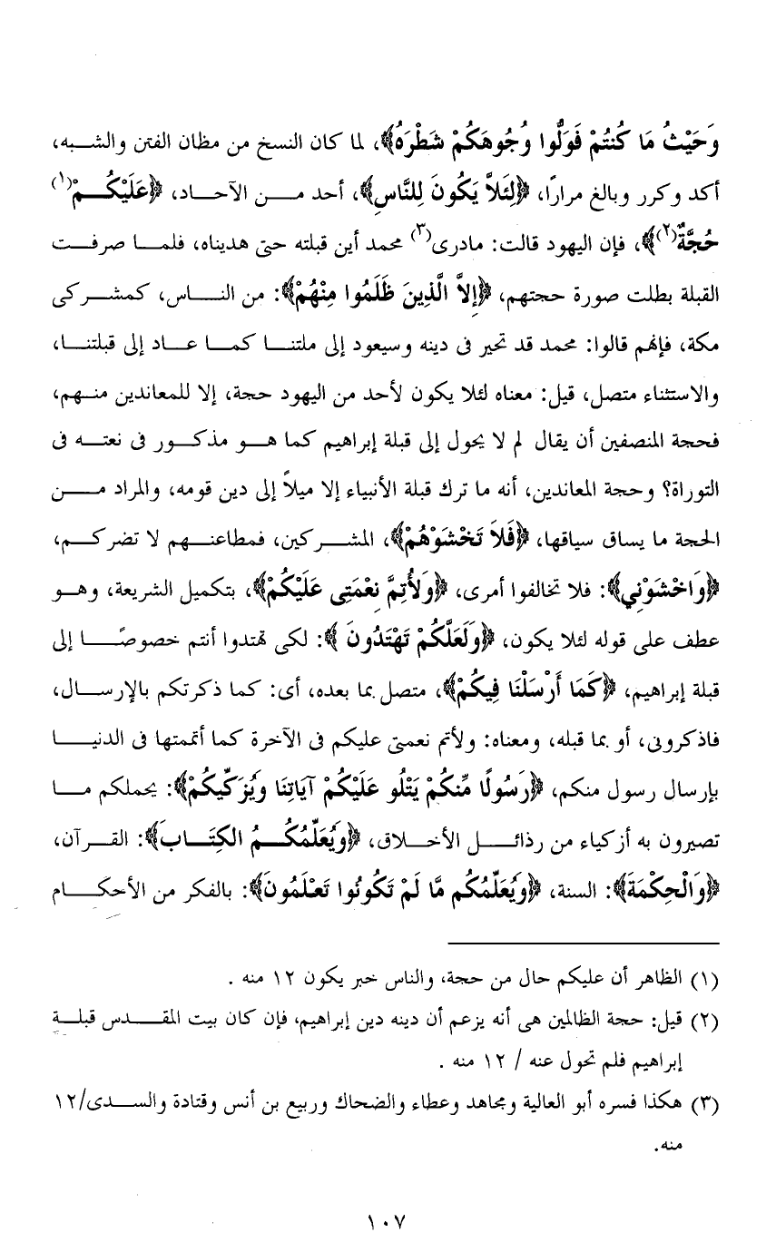 وَحَيْثُ مَا كُنْتُمْ فَوَلُّوا وُجُوهَكُمْ شَطْرَهُ)، لما كان النسخ من مظان الفتن والشبه، أكد وكرر وبالغ مرارًا، (لِئَلَّا يَكُونَ لِلنَّاسِ)، أحد من الآحاد، (عَلَيْكُمْ حُجَّةٌ)، فإن اليهود قالت: ما درى محمد أين قبلته حتى هديناه، فلما صرفت القبلة بطلت صورة حجتهم، (إِلا الذِينَ ظَلَمُوا مِنْهُمْ): من الناس، كمشركي مكة، فإنهم قالوا: محمد قد تحير في دينه وسيعود إلى ملتنا كما عاد إلى قبلتنا، والاستثناء متصل، قيل: معناه لئلا يكون لأحد من اليهود حجة، إلا للمعاندين منهم، فحجة المنصفين أن يقال لم لا يحول إلى قبلة إبراهيم كما هو مذكور في نعته في التوراة؟ وحجة المعاندين، أنه ما ترك قبلة الأنبياء إلا ميلاً إلى دين قومه، والمراد من الحجة ما يساق سياقها، (فَلاَ تَخْشَوْهُمْ)، المشركين، فمطاعنهم لا تضركم، (وَاخْشَوْنِي): فلا تخالفوا أمرى، (وَلِأُتِمَّ نِعْمَتِي عَلَيْكُمْ)، بتكميل الشريعة، وهو عطف عدى قوله لئلا يكون، (وَلَعَلكُمْ تَهْتدُون): لكي تهتدوا أنتم خصوصًا إلى قبلة إبراهيم، (كَمَا أَرْسَلْنَا فيكُمْ)، متصل بما بعده، أي: كما ذكركم بالإرسال، فاذكرونى، أو بما قبله، ومعناه: ولأتم نعمتي عليكم في الآخرة كما أتممتها في الدنيا بإرسال رسول منكم، (رَسُولًا مِنْكُمْ يَتْلُو عَلَيْكُمْ آيَاتِنَا وَيُزَكِّيكُمْ): يحملكم ما تصيرون به أزكياء من رذائل الأخلاق، (وَيعَلِّمُكُم الكِتَابَ): القرآن، (وَالْحِكمَةَ): السنة، (وَيُعَلِّمُكُمْ مَا لَمْ تَكُونُوا تَعْلَمُونَ): بالفكر من الأحكام