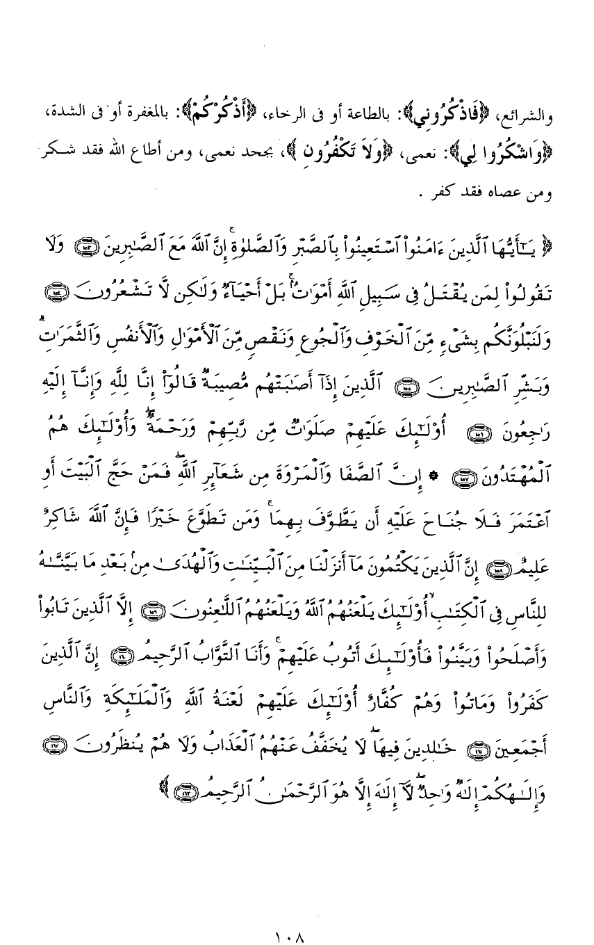 (يَا أَيُّهَا الَّذِينَ آمَنُوا اسْتَعِينُوا بِالصَّبْرِ وَالصَّلَاةِ إِنَّ اللهَ مَعَ الصَّابِرِينَ (153) وَلَا تَقُولُوا لِمَنْ يُقْتَلُ فِي سَبِيلِ اللهِ أَمْوَاتٌ بَلْ أَحْيَاءٌ وَلَكِنْ لَا تَشْعُرُونَ (154) وَلَنَبْلُوَنَّكُمْ بِشَيْءٍ مِنَ الْخَوْفِ وَالْجُوعِ وَنَقْصٍ مِنَ الْأَمْوَالِ وَالْأَنْفُسِ وَالثَّمَرَاتِ وَبَشِّرِ الصَّابِرِينَ (155) الَّذِينَ إِذَا أَصَابَتْهُمْ مُصِيبَةٌ قَالُوا إِنَّا لِلَّهِ وَإِنَّا إِلَيْهِ رَاجِعُونَ (156) أُولَئِكَ عَلَيْهِمْ صَلَوَاتٌ مِنْ رَبِّهِمْ وَرَحْمَةٌ وَأُولَئِكَ هُمُ الْمُهْتَدُونَ (157) إِنَّ الصَّفَا وَالْمَرْوَةَ مِنْ شَعَائِرِ اللهِ فَمَنْ حَجَّ الْبَيْتَ أَوِ اعْتَمَرَ فَلَا جُنَاحَ عَلَيْهِ أَنْ يَطَّوَّفَ بِهِمَا وَمَنْ تَطَوَّعَ خَيْرًا فَإِنَّ اللهَ شَاكِرٌ عَلِيمٌ (158) إِنَّ الَّذِينَ يَكْتُمُونَ مَا أَنْزَلْنَا مِنَ الْبَيِّنَاتِ وَالْهُدَى مِنْ بَعْدِ مَا بَيَّنَّاهُ لِلنَّاسِ فِي الْكِتَابِ أُولَئِكَ يَلْعَنُهُمُ اللهُ وَيَلْعَنُهُمُ اللَّاعِنُونَ (159) إِلَّا الَّذِينَ تَابُوا وَأَصْلَحُوا وَبَيَّنُوا فَأُولَئِكَ أَتُوبُ عَلَيْهِمْ وَأَنَا التَّوَّابُ الرَّحِيمُ (160) إِنَّ الَّذِينَ كَفَرُوا وَمَاتُوا وَهُمْ كُفَّارٌ أُولَئِكَ عَلَيْهِمْ لَعْنَةُ اللهِ وَالْمَلَائِكَةِ وَ النَّاسِ أَجْمَعِينَ (161) خَالِدِينَ فِيهَا لَا يُخَفَّفُ عَنْهُمُ الْعَذَابُ وَلَا هُمْ يُنْظَرُونَ (162) وَإِلَهُكُمْ إِلَهٌ وَاحِدٌ لَا إِلَهَ إِلَّا هُوَ الرَّحْمَنُ الرَّحِيمُ (163)