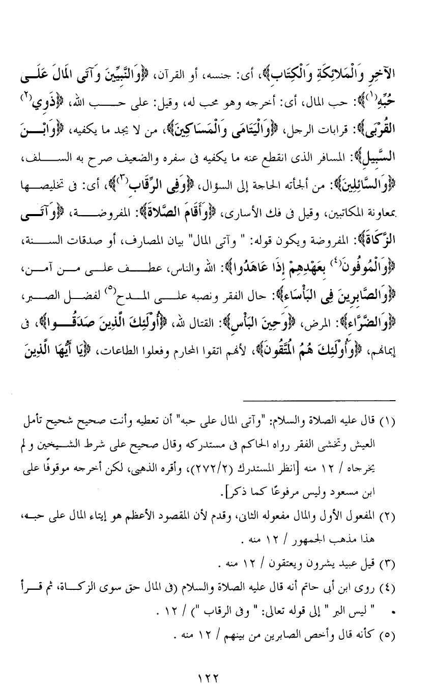 الآخِرِ وَالْمَلائكَةِ وَالْكِتَابِ)، أي: جنسه، أو القرآن، (وَالنَّبِيِّينَ وَآتى الْمَالَ عَلَى حُبِّهِ): حب المال، أي: أخرجه وهو محب له، وقيل: على حبِّ الله، (ذَوِي القُرْبَى): قرابات الرجل، (وَالْيَتَامَى وَالْمَسَاكِينَ)، من لا يجد ما يكفيه، (وَابْن السَّبِيلِ): المسافر الذي انقطع عنه ما يكفيه في سفره والضعيف صرح به السلف، (وَالسائِلينَ): من ألجأته الحاجة إلى السؤال، (وَفِي الرِّقَابِ)، أي: في تخليصها بمعاونة المكاتبين، وقيل في فك الأسارى، (وَأَقَامَ الصَّلاةَ): المفروضة، (وَآتى الزَّكَاةَ): المفروضة ويكون قوله: " وآتى المال " بيان المصارف، أو صدقات السنة، (وَالْمُوفُونَ بِعَهْدِهِمْ إِذَا عَاهَدُوا): الله والناس، عطف على من آمن، (وَالصابِرِينَ فِي البَأْسَاءِ): حال الفقر ونصبه على المدح لفضل الصبر، (وَالضَّراء): المرض، (وَحِينَ البَأسِ): القتال لله، (أُولَئِكَ الَّذِينَ صَدَقُوا)، في إبمانهم، (وَأُولَئِكَ هُمُ الْمُتَّقُونَ)، لأنَّهُم اتقوا المحارم وفعلوا الطاعات، (يَا أَيُّهَا الذِينَ