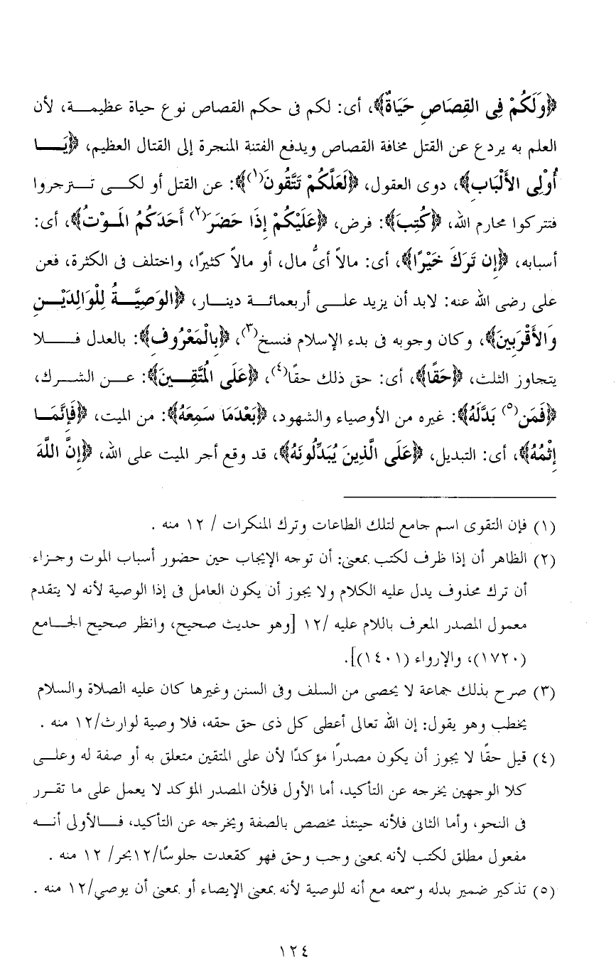 (وَلَكُمْ فِي الْقِصَاصِ حَيَاةٌ يَا أُولِي الْأَلْبَابِ)، أي: لكم في حكم القصاص نوع حياة عظيمة، لأن العلم به يردع عن القتل مخافة القصاص ويدفع الفتنة المنجرة إلى القتال العظيم، (يَا أُولِي الْأَلْبَابِ)، ذوي العقول، (لَعَلَّكُمْ تَتَّقُونَ): عن القتل أو لكي تنزجروا فتتركوا محارم الله، (كُتِبَ): فرض، (عَلَيْكُمْ إِذَا حَضَرَ أَحَدَكُمُ المَوْتُ)، أي: أسبابه، (إِنْ تَرَكَ خَيْرًا)، أي: مالاً أيُّ مال، أو مالاً كثيرًا، واختلف في الكثرة، فعن علي رضى الله عنه: لا بد أن يزيد على أربعمائة دينار، (الوَصِيَّةُ لِلْوَالِدَيْنِ وَالأَقْرَبِين)، وكان وجوبه في بدء الإسلام فنسخ، (بِالْمَعْرُوف): بالعدل فلا يتجاوز الثلث، (حَقًا)، أي: حق ذلك حقًا، (عَلَى الْمُتَّقِينَ): عن الشرك، (فَمَن بَدَّله): غيره من الأوصياء والشهود، (بَعْدَمَا سَمِعَهُ): من الميت، (فَإِنَّمَا إِثْمُهُ)، أي: التبديل، (عَلَى الَّذِينَ يُبَدِّلُونَهُ)، قد وقع أجر الميت على الله، (إِنَّ اللهَ