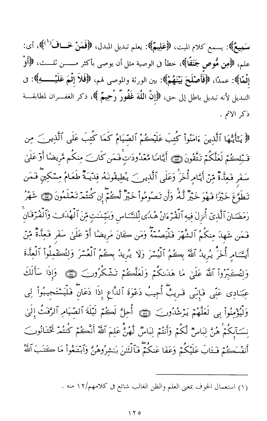 سَمِيعٌ): يسمع كلام الميت، (عَلِيمٌ): يعلم تبديل المبدل، (فَمَنْ خَافَ)، أي: علم، (مِن مُّوصٍ جَنَفًا)، خطأ في الوصية مثل أن يوصى بأكثر من ثلث، (أَوْ إِثْمًا): عمدًا، (فَأَصْلَحَ بَيْنَهُمْ): بين الورثة والموصى لهم، (فَلاَ إِثْمَ عَلَيْهِ): في التبديل لأنه تبديل باطل إلى حق، (إِنَّ اللهَ غَفُورٌ رَحِيمٌ)، ذكر الغفران لمطابقة ذكر الإثم.