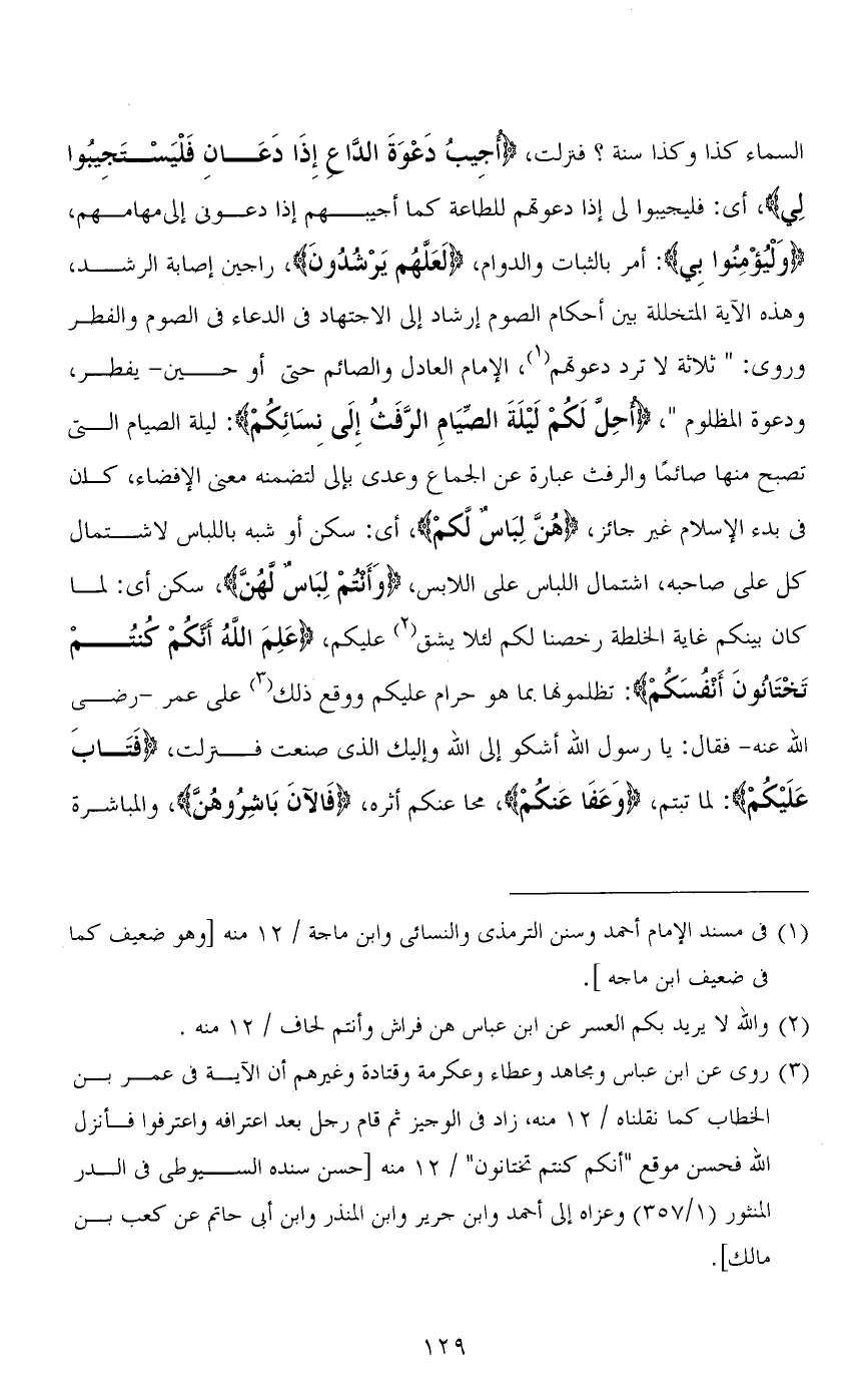 السماء كذا وكذا سنة؟ فنزلت، (أجِيبُ دَعْوَةَ الدَّاع إِذَا دَعَان فَلْيَسْتَجِيبُوا لي)، أي: فليجيبوا لي إذا دعوتهم للطاعة كما أجيبهم إذا دعوني إلى مهامهم، (وَلْيُؤْمِنُوا بِي): أمر بالثبات والدوام، (لَعَلَّهُم يَرْشُدُون)، راجين إصابة الرشد، وهذه الآية المتخللة بين أحكام الصوم إرشاد إلى الاجتهاد في الدعاء في الصوم والفطر وروي: " ثلاثة لا ترد دعوتهم، الإمام العادل والصائم حتى أو حين - يفطر، ودعوة المظلوم "، (أُحِلَّ لَكُمْ لَيْلَةَ الصِّيَامِ الرَّفَثُ إِلَى نِسَائِكُمْ): ليلة الصيام التي تصبح منها صائمًا والرفث عبارة عن الجماع وعدى بـ إلى لتضمنه معنى الإفضاء، كان فى بدء الإسلام غير جائز، (هُنَّ لِبَاسٌ لكمْ)، أي: سكن أو شبه باللباس لاشتمال كل على صاحبه، اشتمال اللباس على اللابس، (وَأَنتمْ لِبَاسٌ لهُنَّ)، سكن أي: لما كان بينكم غاية الخلطة رخصنا لكم لئلا يشق عليكم، (عَلِمَ اللهُ أَنَّكُمْ كُنْتُمْ تَخْتَانُونَ أَنْفُسَكُمْ): تظلمونها بما هو حرام عليكم ووقع ذلك على عمر - رضى الله عنه - فقال: يا رسول الله أشكو إلى الله وإليك الذي صنعت فنزلت، (فَتَابَ عَلَيْكُمْ): لما تبتم، (وَعَفَا عَنْكُمْ)، محا عنكم أثره، (فَالْآنَ بَاشِرُوهُنَّ)، والمباشرة